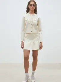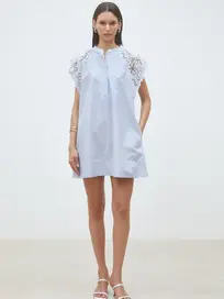 This floral pattern mini dress from FARM Rio, features a high neckline, long blouson sleeves, and a fitted silhouette that flares slightly at the hem, creating a graceful movement. A belt with beaded buckle, cinches the waist and finishes the look.