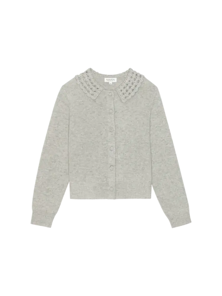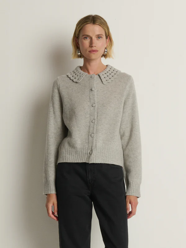 • The Addie Cardigan wraps soft texture in effortless style—knit in 100% merino wool with a relaxed fit. A hand-crocheted Peter Pan collar and bishop sleeves bring subtle volume and refinement to a piece you can wear anywhere.