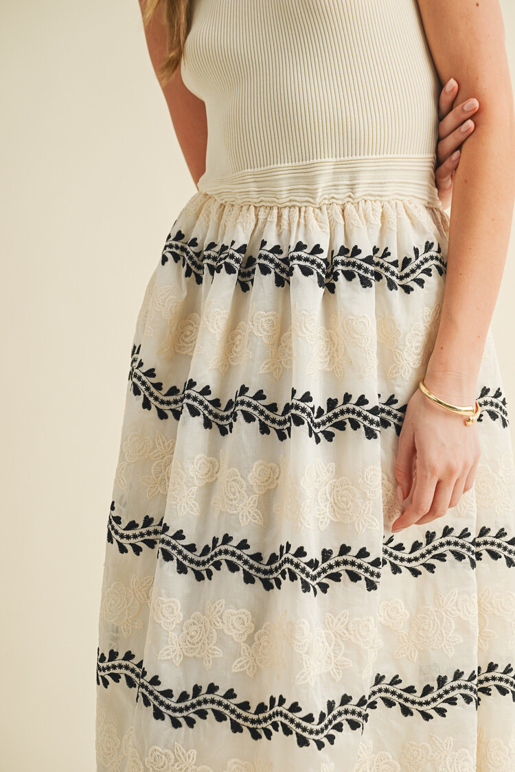 • A sleeveless knit and woven maxi dress featuring a fitted ribbed bodice and a full embroidered skirt. Contrasting black floral stitching adds texture and charm to the flowy silhouette. 65% Viscose, 35% Nylon