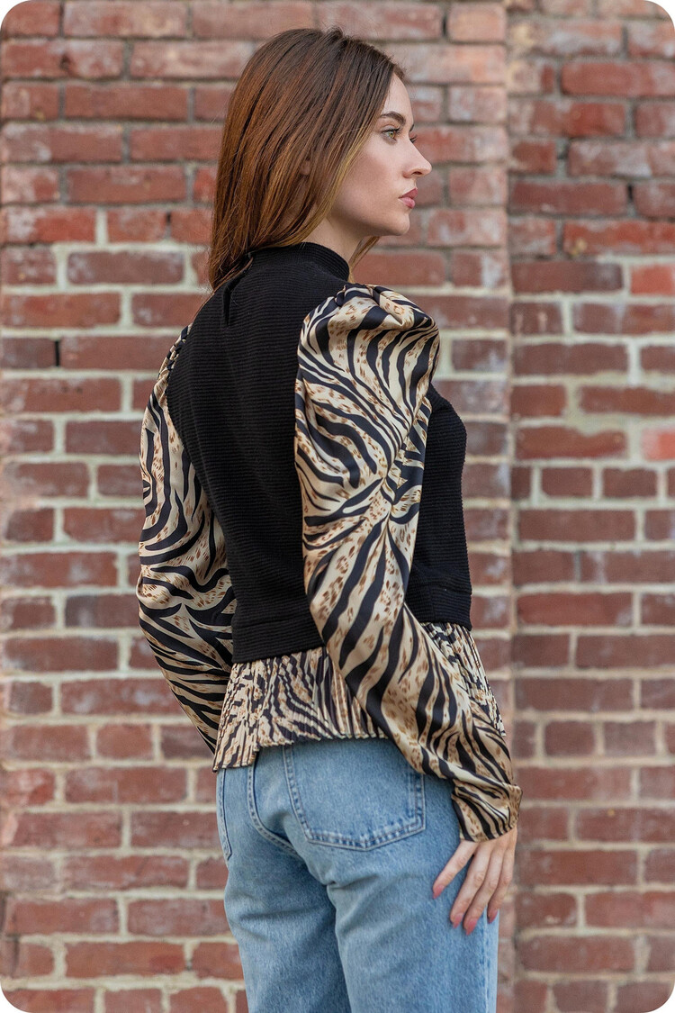 Studio Strut and Bolt Collection. Mixed media knit top in zebra print on stretch satin and stretch knit fabrics. This top features bodice in knit fabric, mock neck, long puff sleeve with shirred shoulder, and pleated hem.