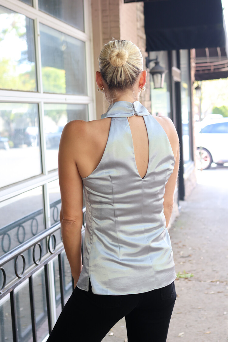 • Crafted from a luxurious satin-like fabric in a lustrous chrome color, the top features an elegant funnel neckline that drapes into a subtle cowl. It has a chic halter-style silhouette that elegantly exposes the shoulders and back