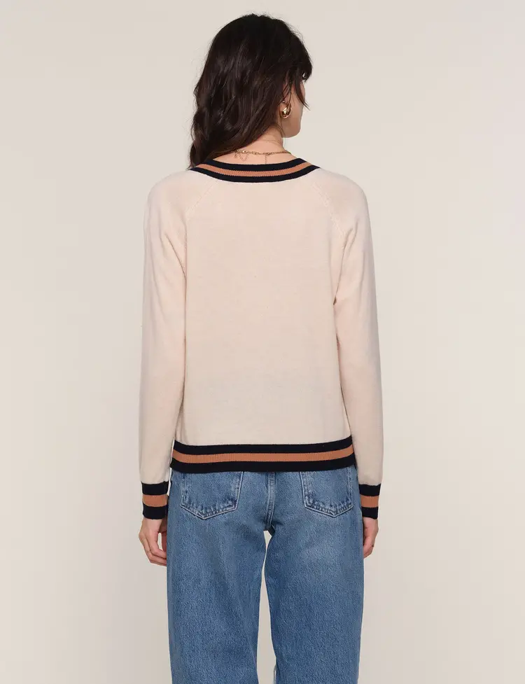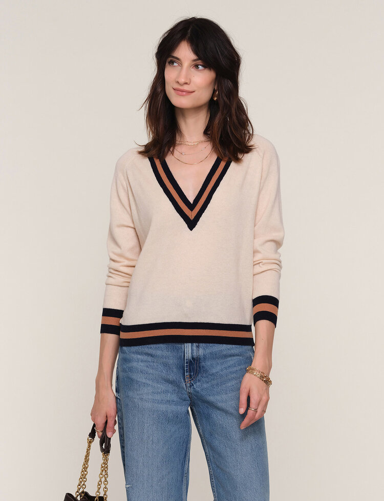 • The Aella Sweater is inspired by our favorite vintage, varsity sweater. Made from a cashmere blend it features contrast striped tipping and a cool, relaxed fit.