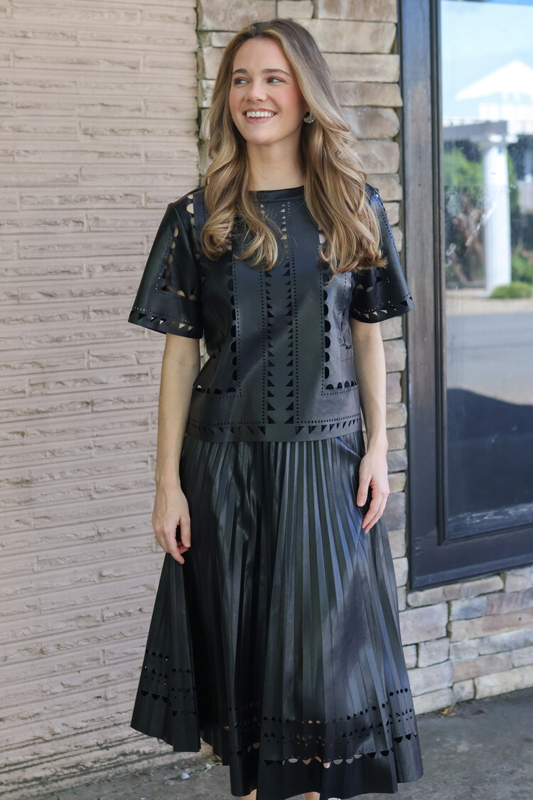 The Alana Skirt in black vegan leather is a modern take on a classic pleated silhouette. This midi-length style features sharp, structured pleats that create beautiful movement and texture, while the waistband offers a flattering, polished fit.