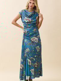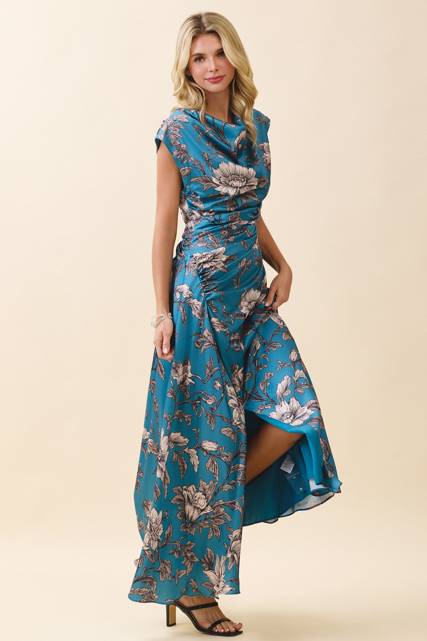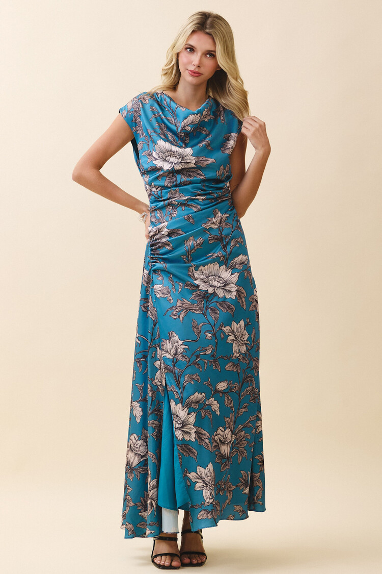 A floral printed satin maxi dress featuring a draped cowl neckline and ruched side detailing. Designed with cap sleeves and a subtle front slit for ease of movement, finished with a back keyhole and button closure. 95% Polyester, 5% Spandex