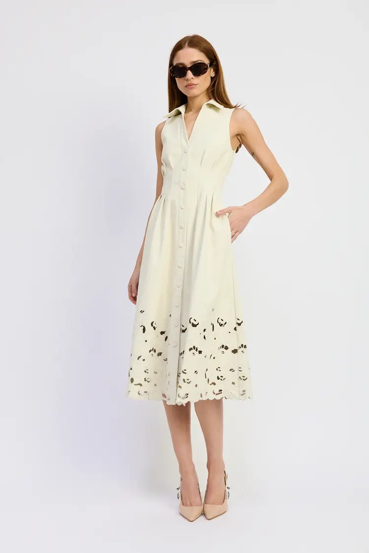 Button Front Collared Midi Dress With Laser Cut Floral Embroidered Hem