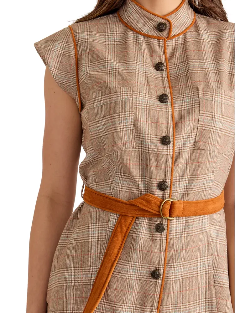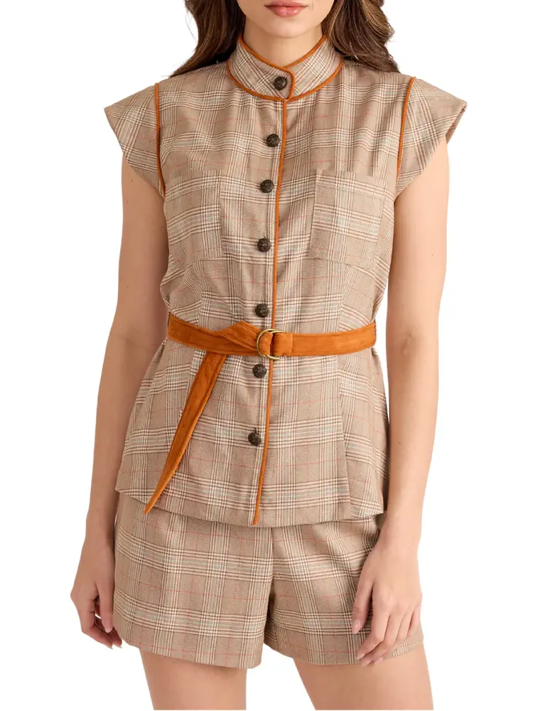 This Top features a high neck and cap sleeves. Its plaid print is accented with camel piping and belt, creating style and shape. Front buttons add subtle detail, making this top perfect to pair with skirts or denim all fall long for a polished, chic look.