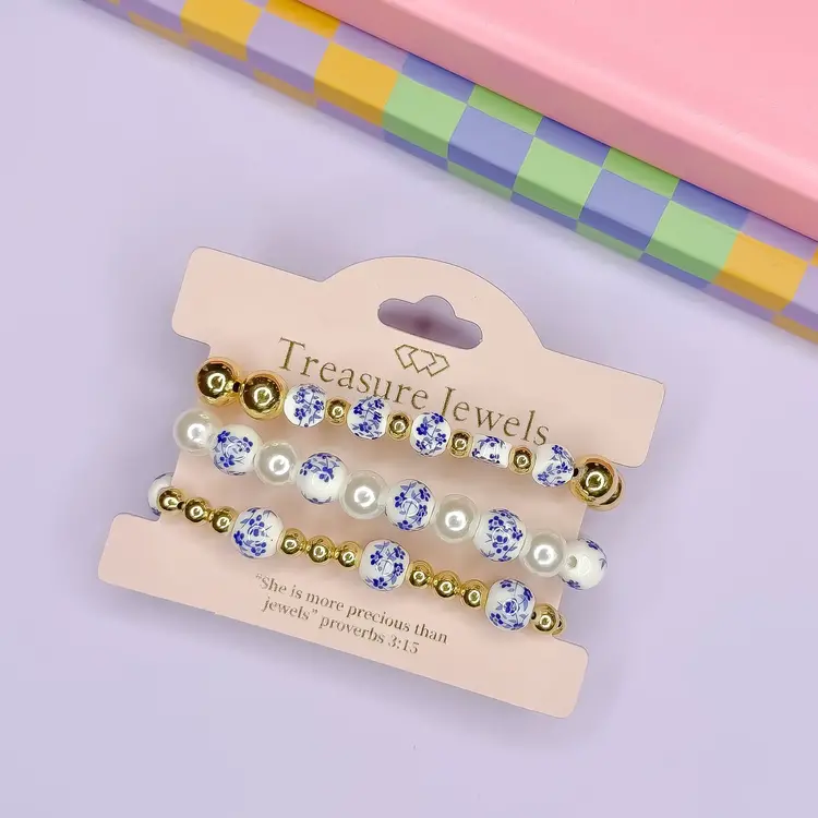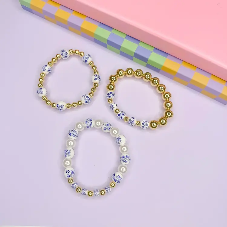 • Delicate blue-and-white floral beads, classic pearls, and gleaming gold accents. It’s the perfect blend of vintage romance and modern elegance, ready to dress up your wrist with a touch of sweet sophistication.