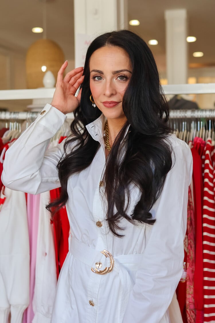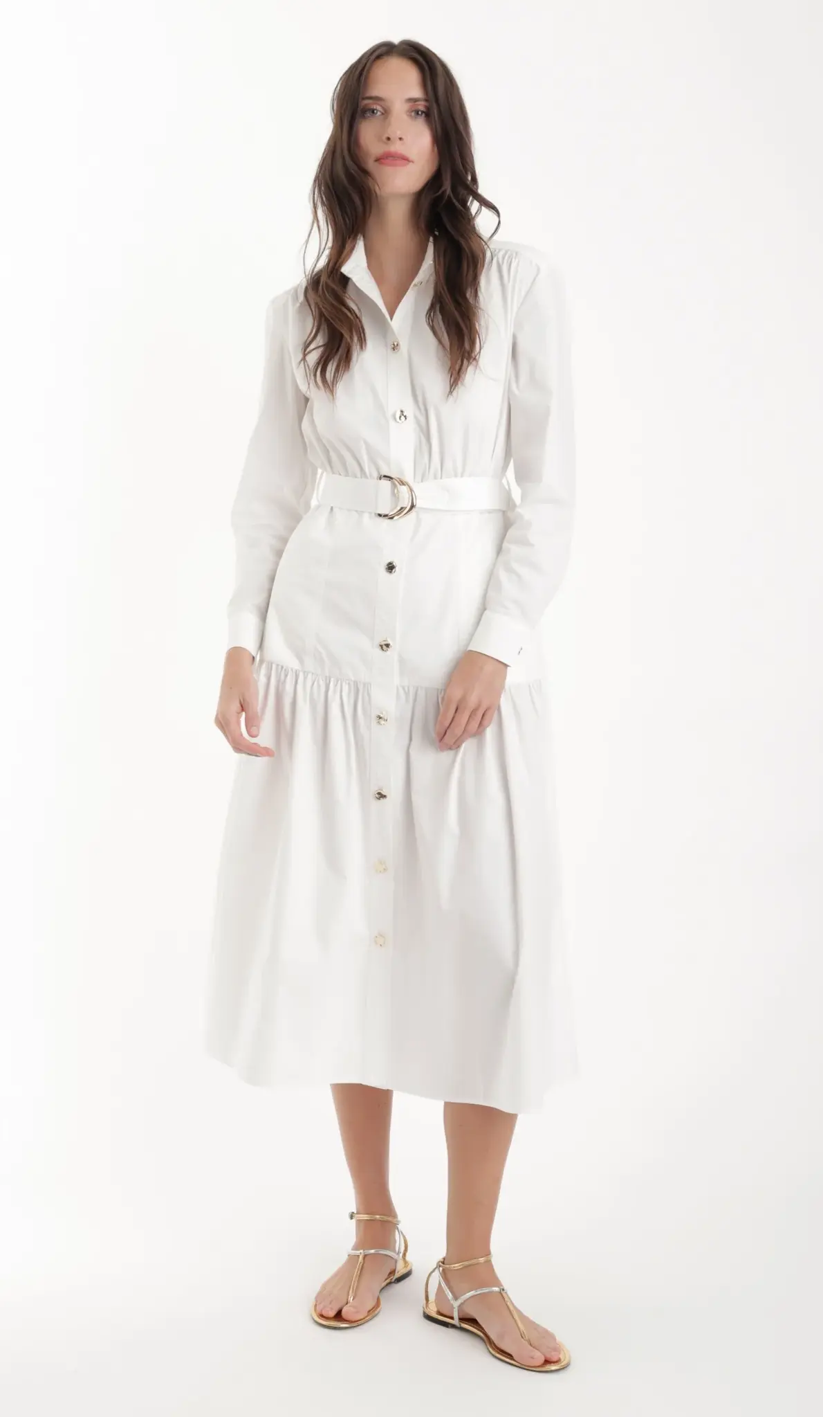 • The Ame Dress by Karina Grimaldi, crafted from 100% cotton, features a chic midi length and elegant long sleeves. Beautiful gold button details add a striking contrast to its crisp white design, perfect for effortless sophistication.