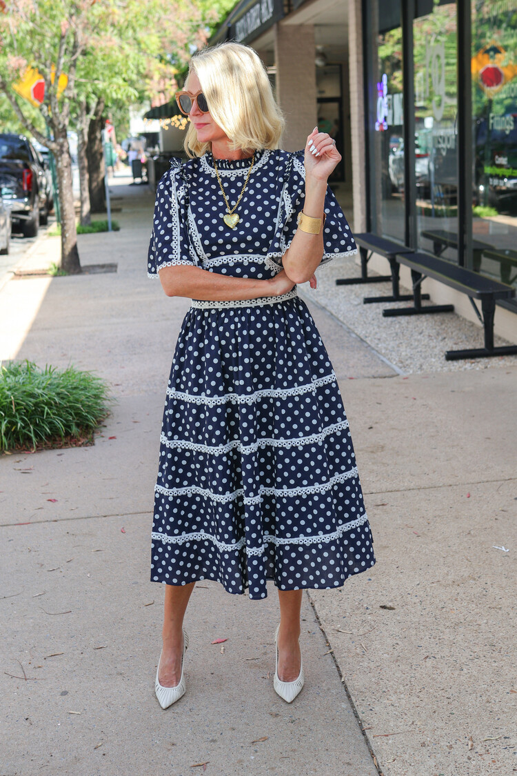 • This navy and white polka dot midi dress brings a playful charm to your wardrobe. Featuring delicate eyelet trim, it adds a touch of whimsy and texture to the classic polka dot pattern. Perfect for sunny days or casual outings.