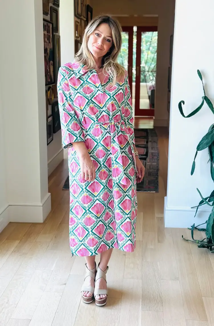 Gorgeous button-down caftan style shirt dress. The perfect length sleeve and an easy to wear style, perfect for all occasions this spring. From church, to brunch, to school pick up, you will be sure to look sleek in this gorgeous dress.