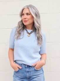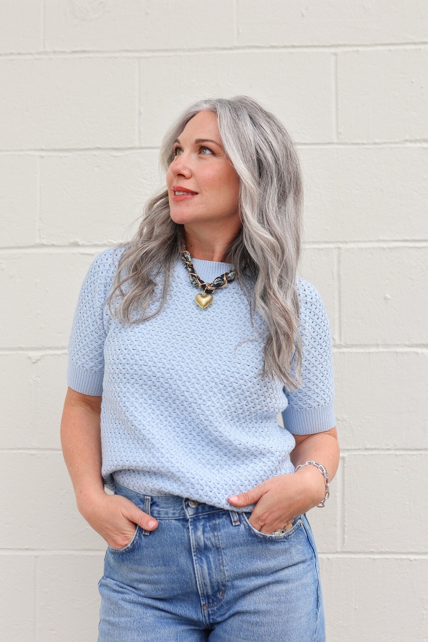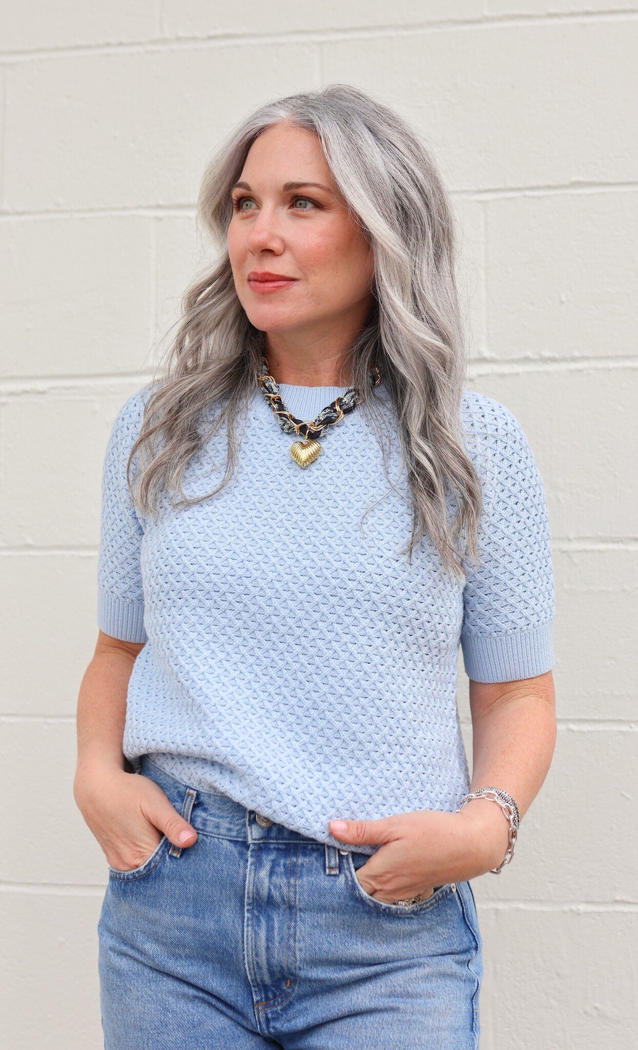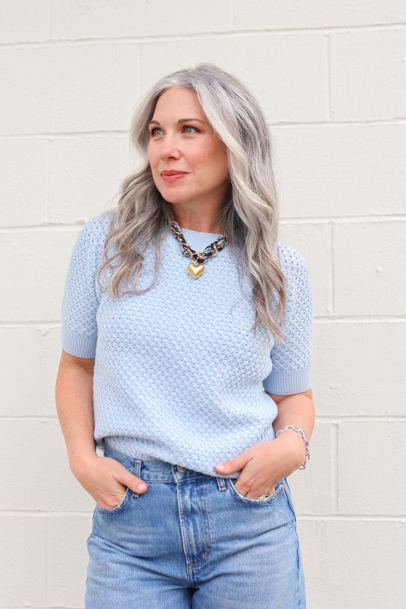 • Loose knot crochet knit short sleeve sweater. Boxy fit, true to size.