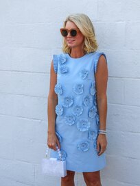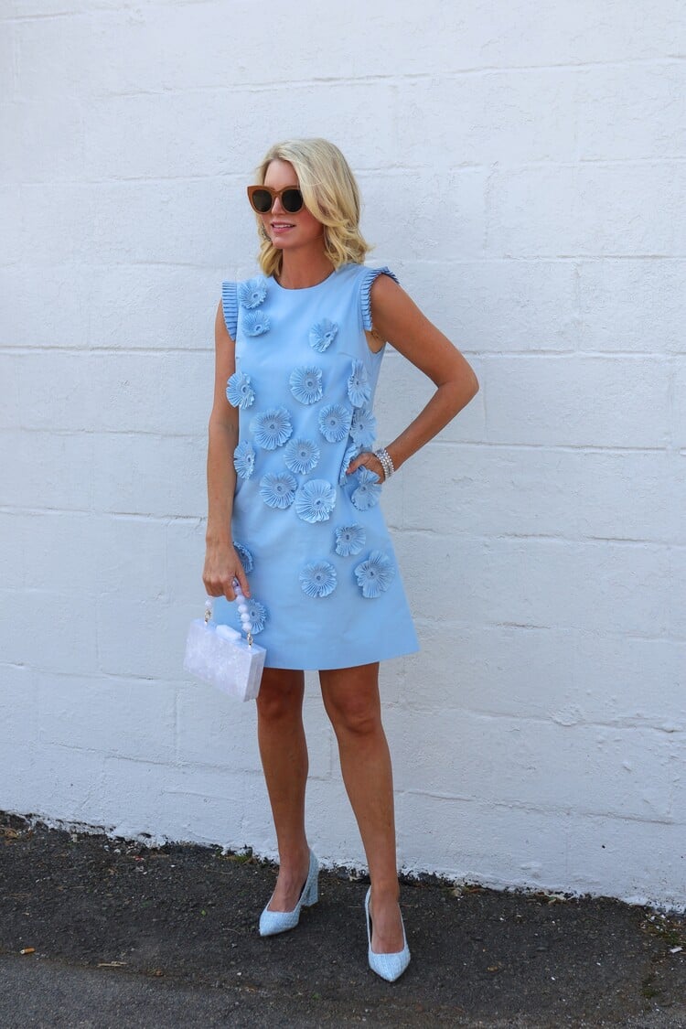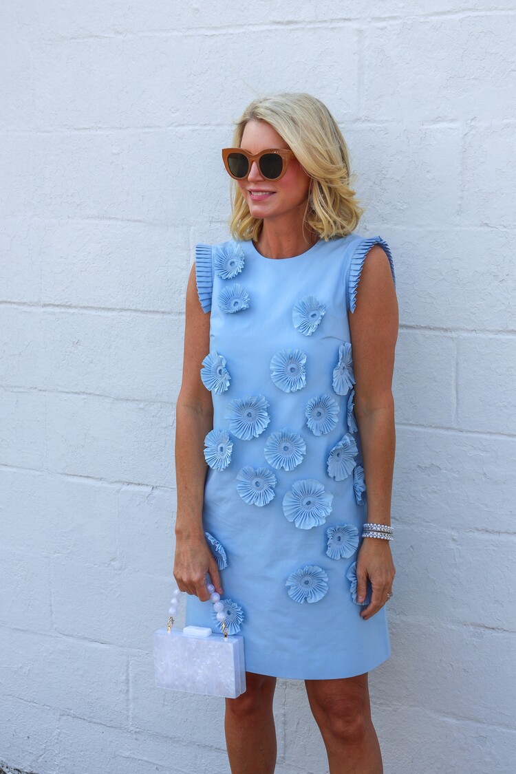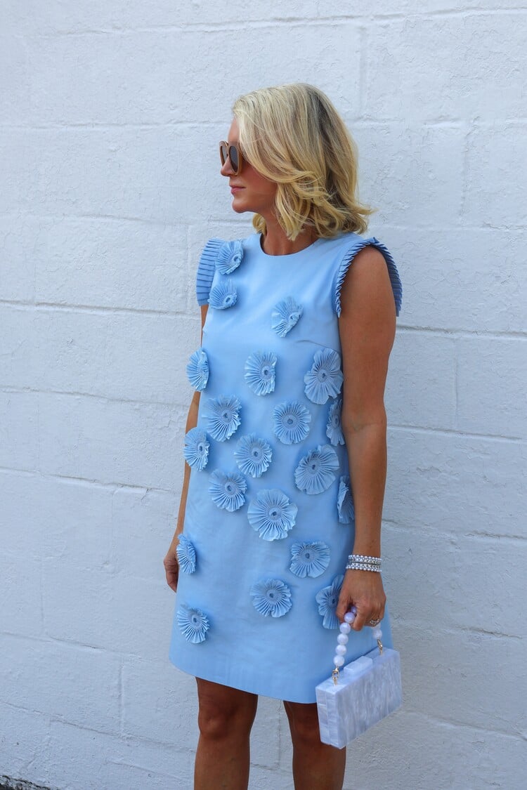 • A gorgeous baby blue dress with pleated sleeves and floral appliqués!