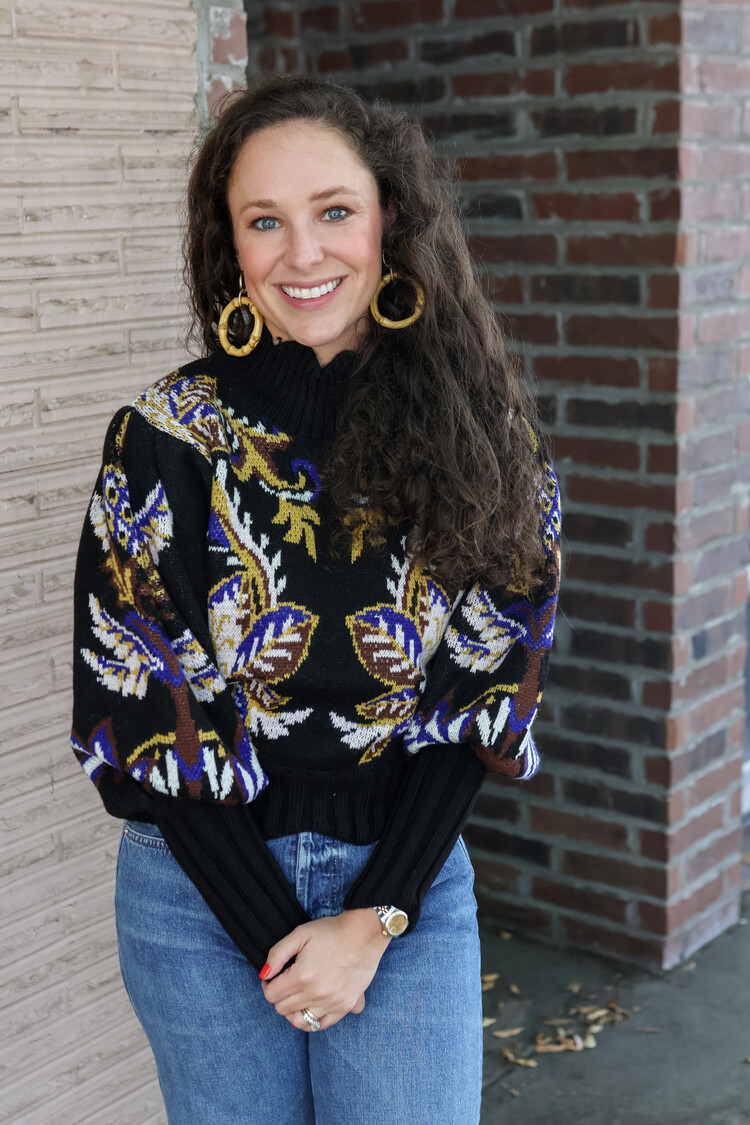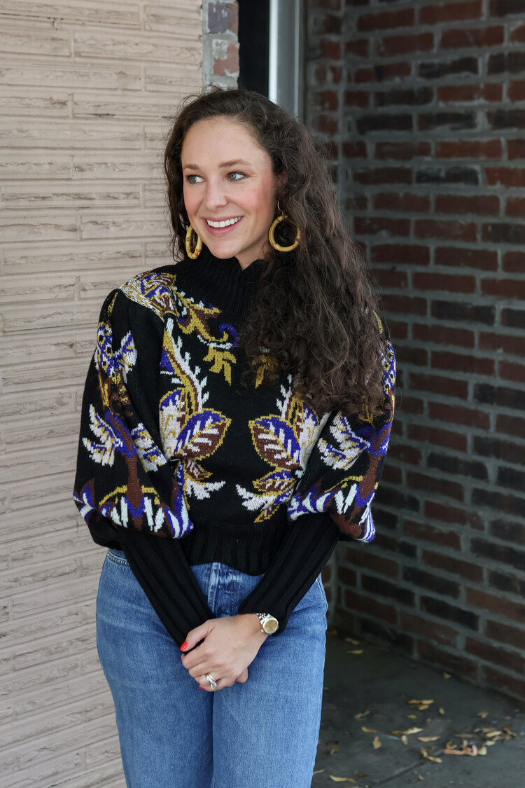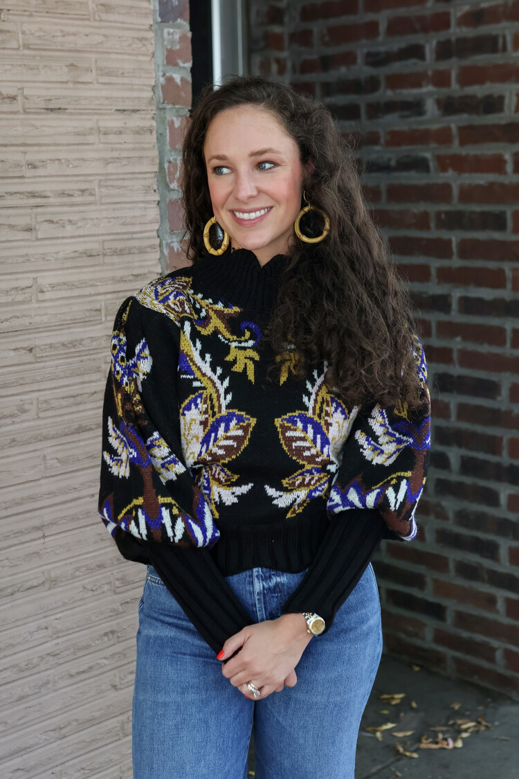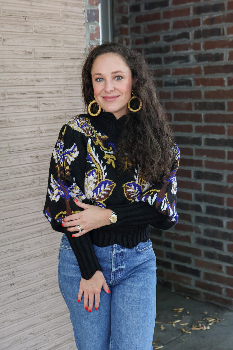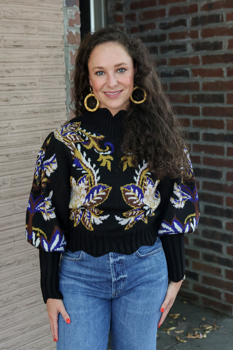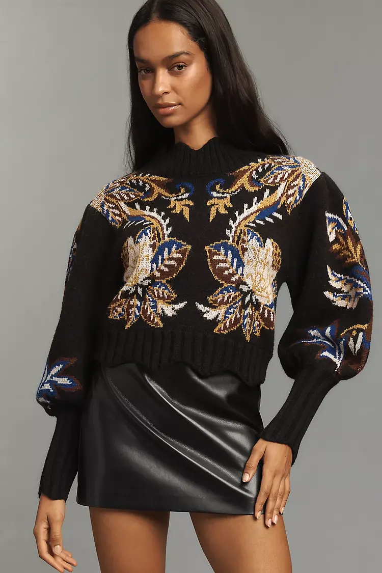 • Fresh from Farm Rio, this plush pullover makes a statement with a high scalloped neckline and dramatic balloon sleeves. 55% acrylic, 35% polyamide, 10% wool