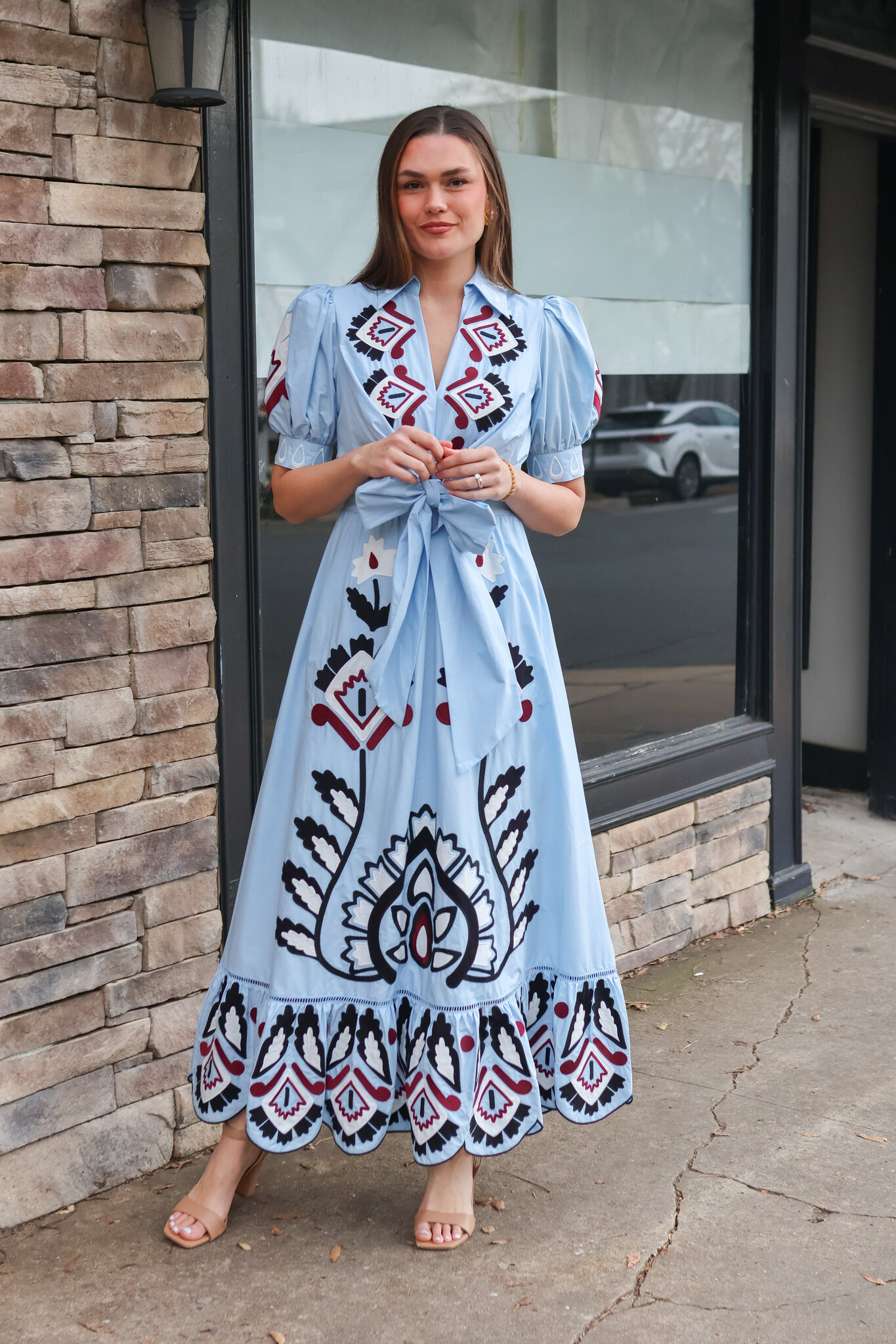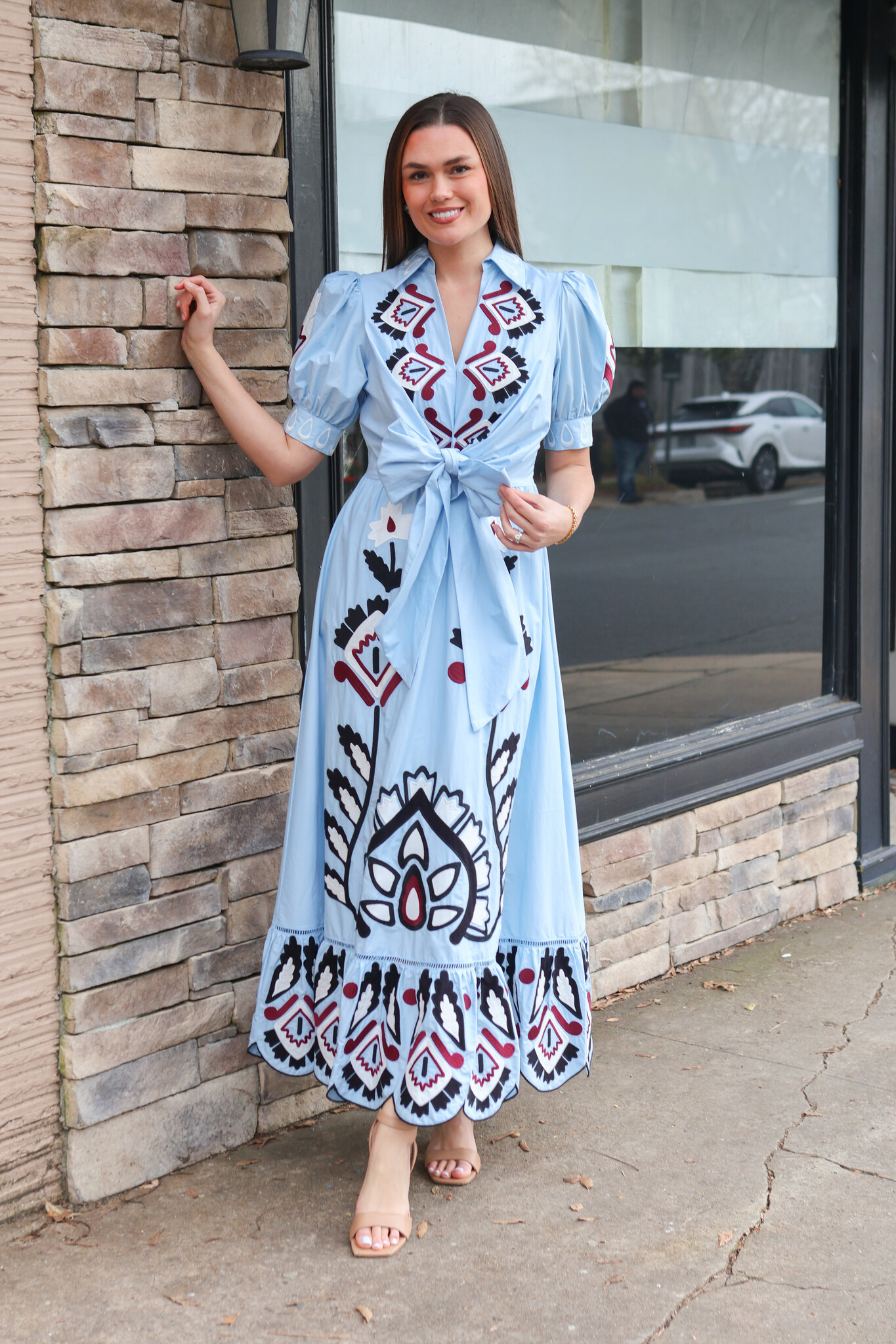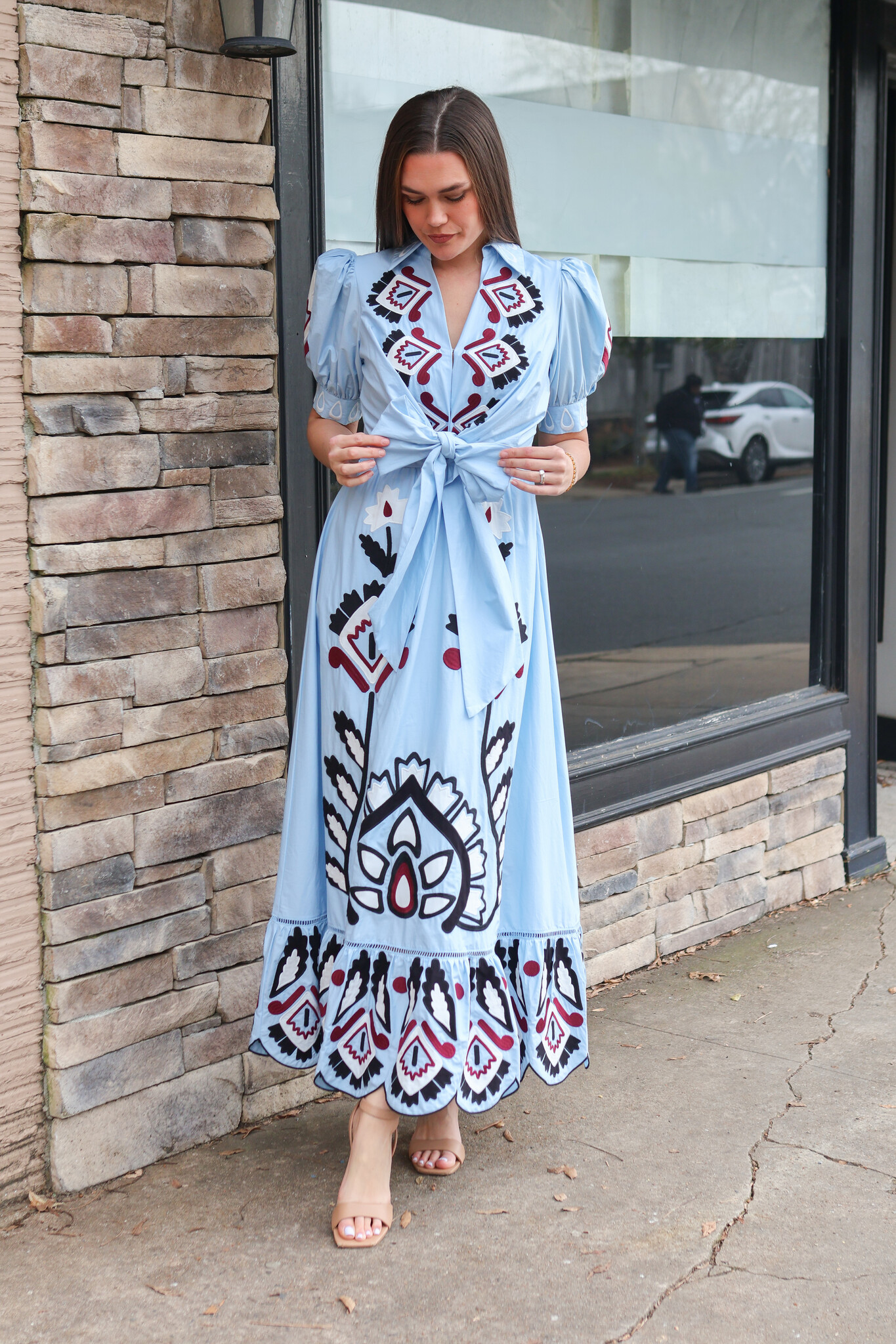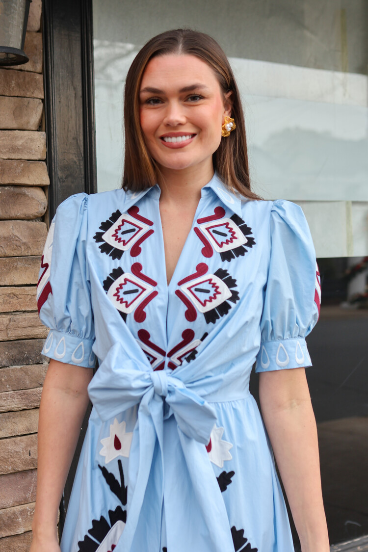 • This dress features a delicate V neckline and intricate hand-embroidered lace that dances across the bodice. The flowing silhouette is softened by a front bow, creating a playful yet graceful movement. Its deep blue hue echoes warm Brazilian sunsets.