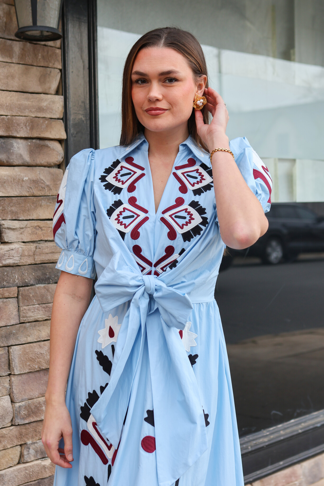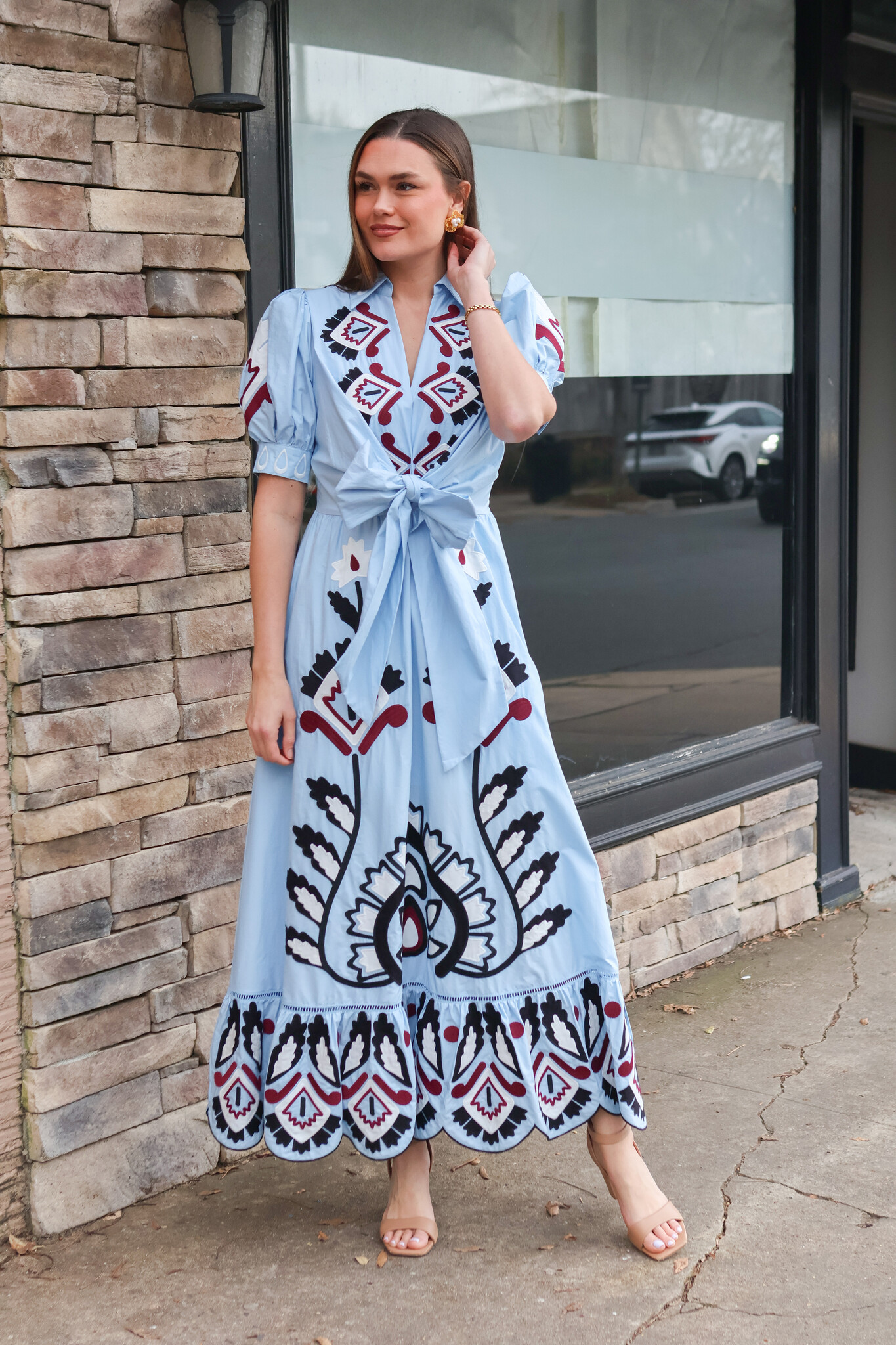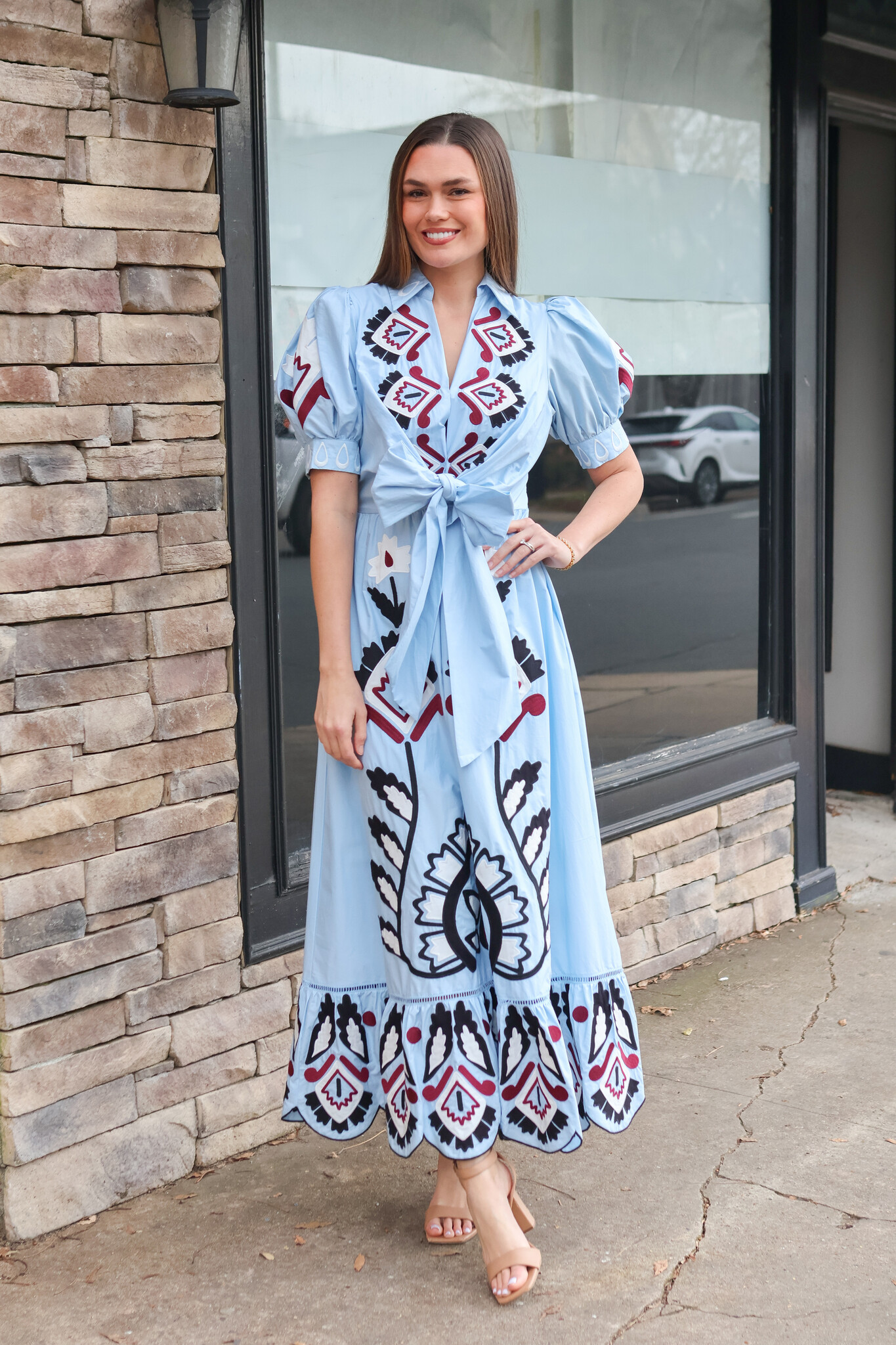 • This dress features a delicate V neckline and intricate hand-embroidered lace that dances across the bodice. The flowing silhouette is softened by a front bow, creating a playful yet graceful movement. Its deep blue hue echoes warm Brazilian sunsets.