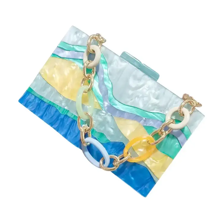 • Bold and stylish, the Ashley Bag is the perfect statement accessory. This multi-color acrylic clutch features a sleek, structured design with an 8"x6"x2" silhouette. Complete with a removable chain strap for versatile styling.