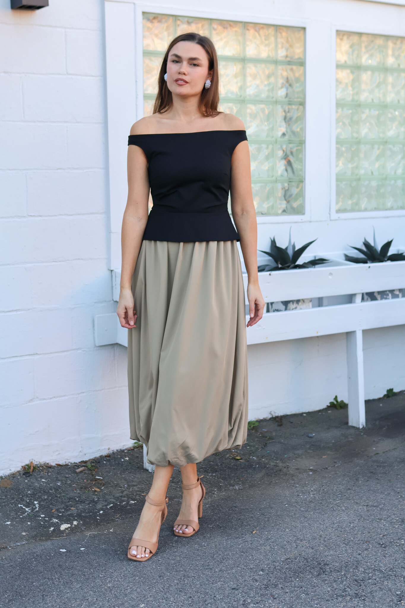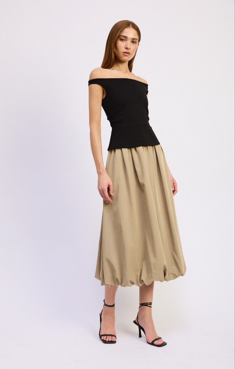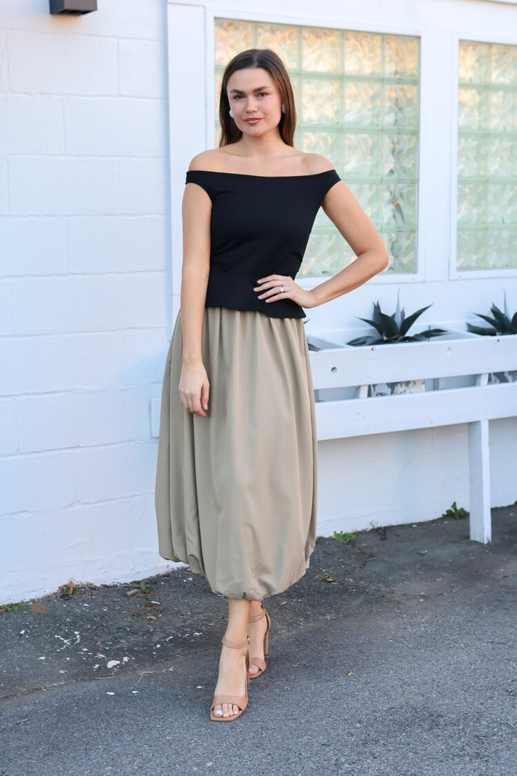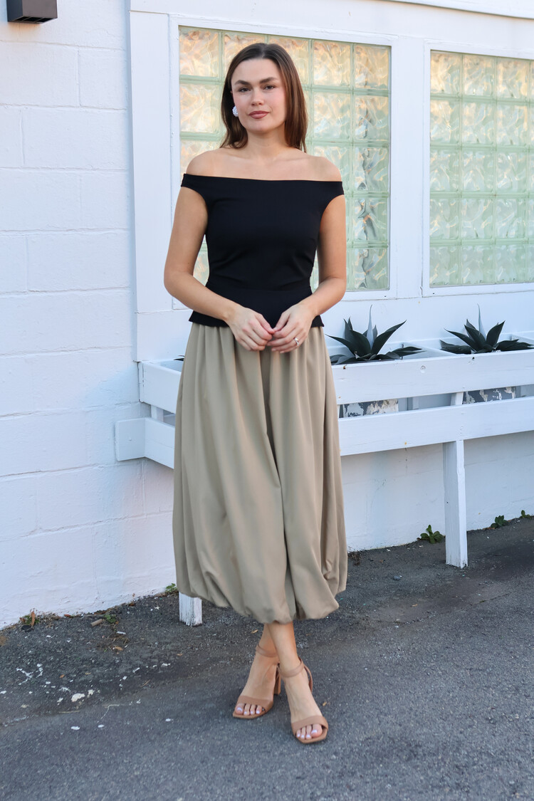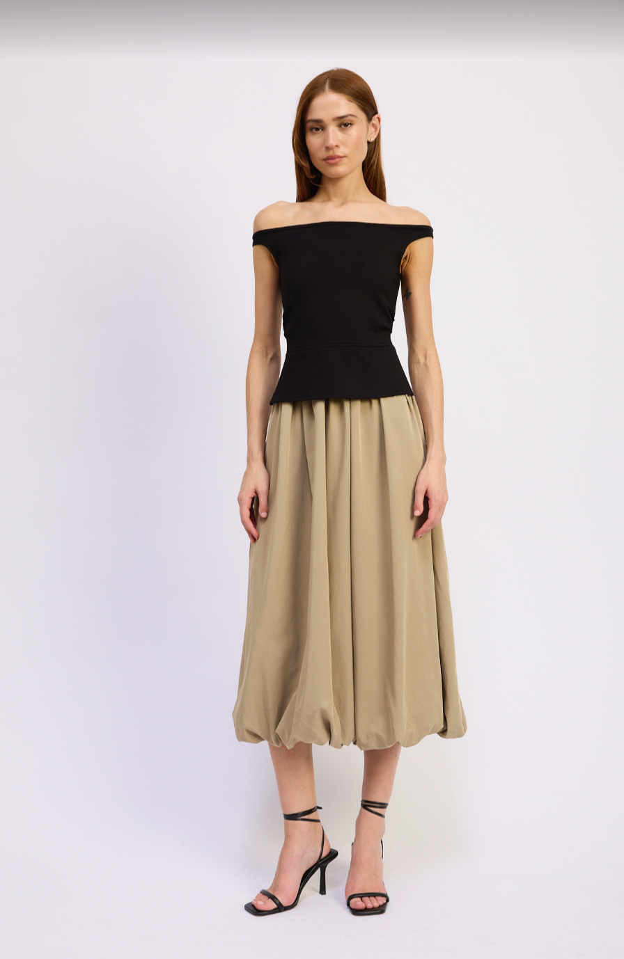 This dress blends tailored structure with effortless sophistication. Featuring a clean collared neckline, concealed button placket, and a matching belt that defines the waist, it’s finished with flap pockets and subtly puffed sleeves for added dimension.