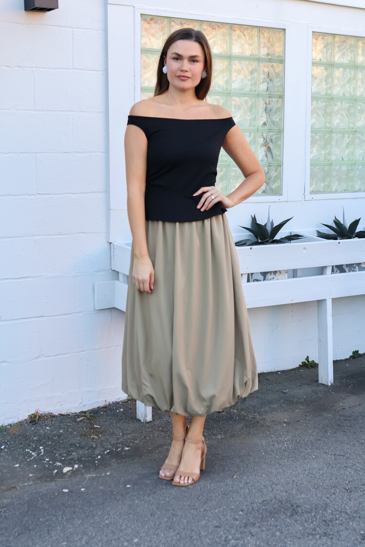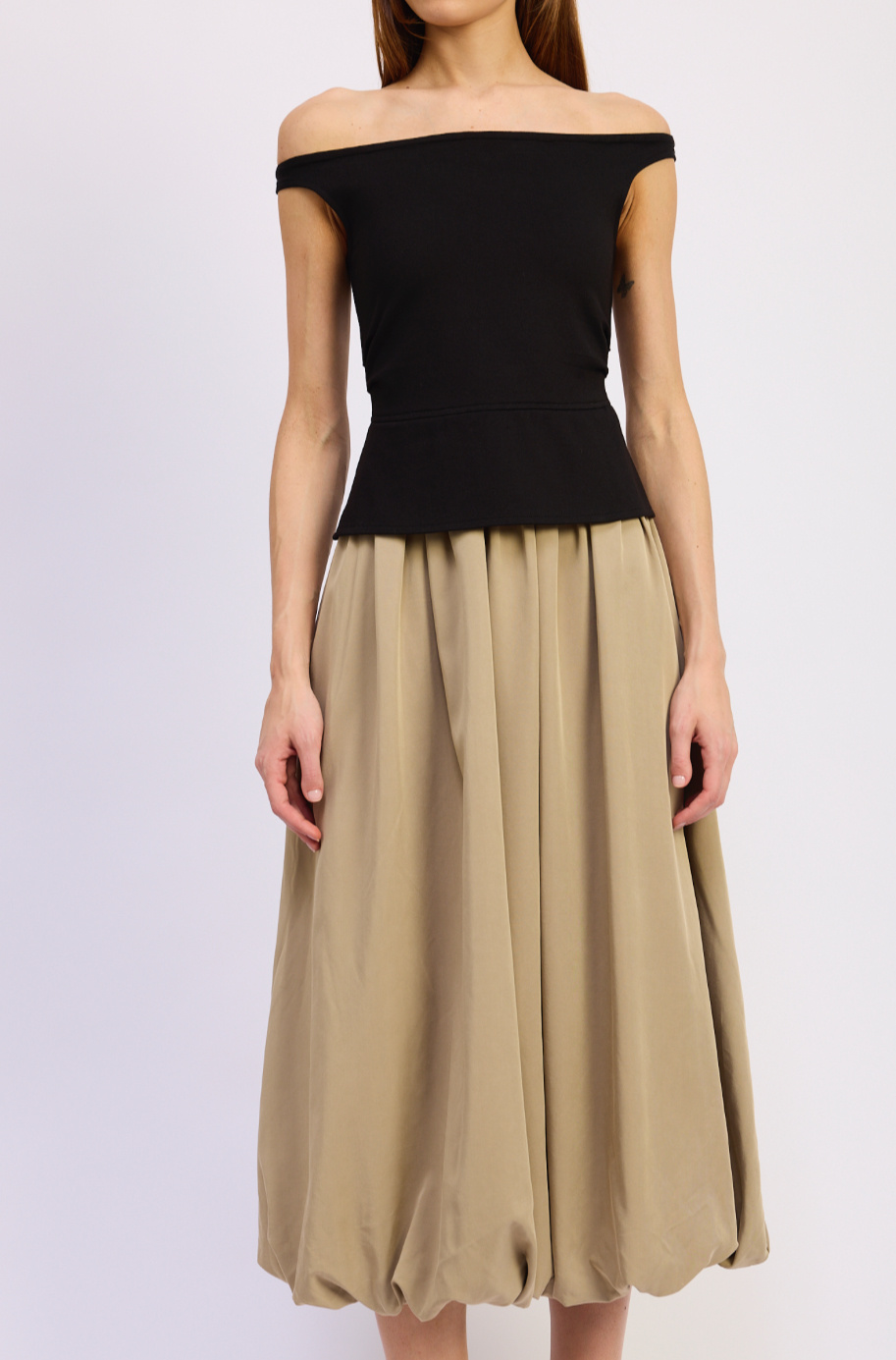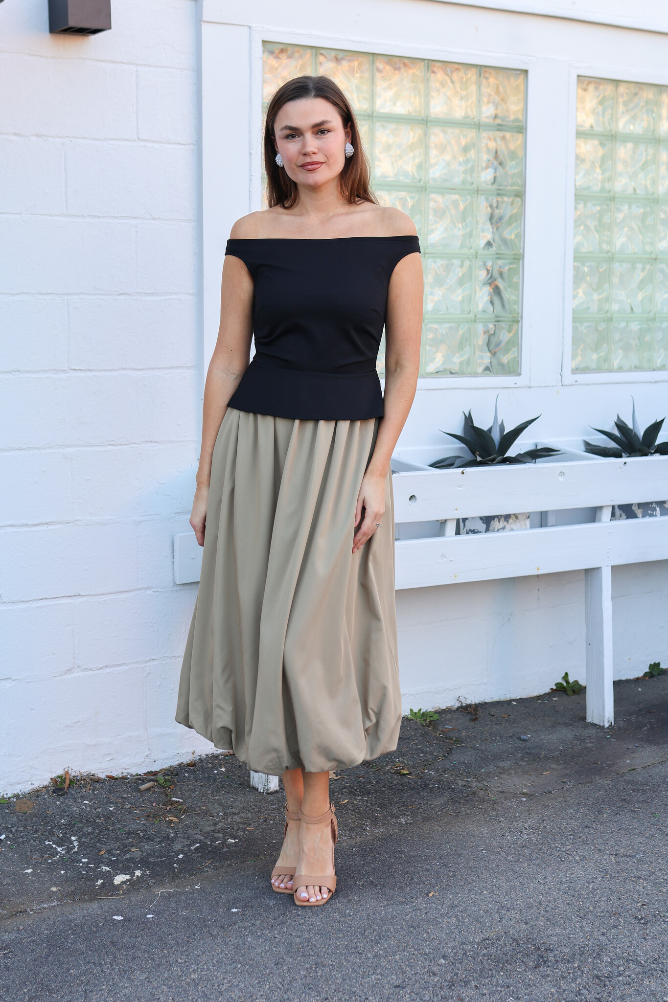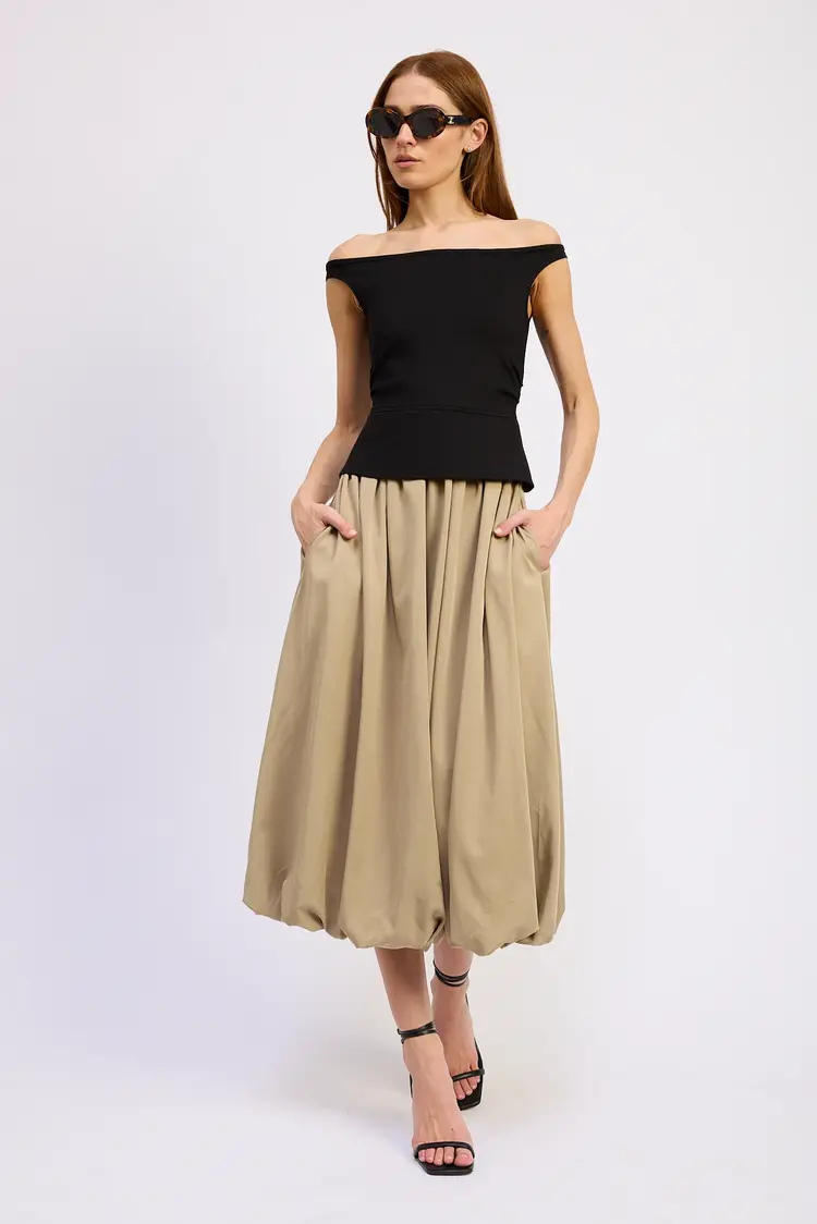 This dress blends tailored structure with effortless sophistication. Featuring a clean collared neckline, concealed button placket, and a matching belt that defines the waist, it’s finished with flap pockets and subtly puffed sleeves for added dimension.