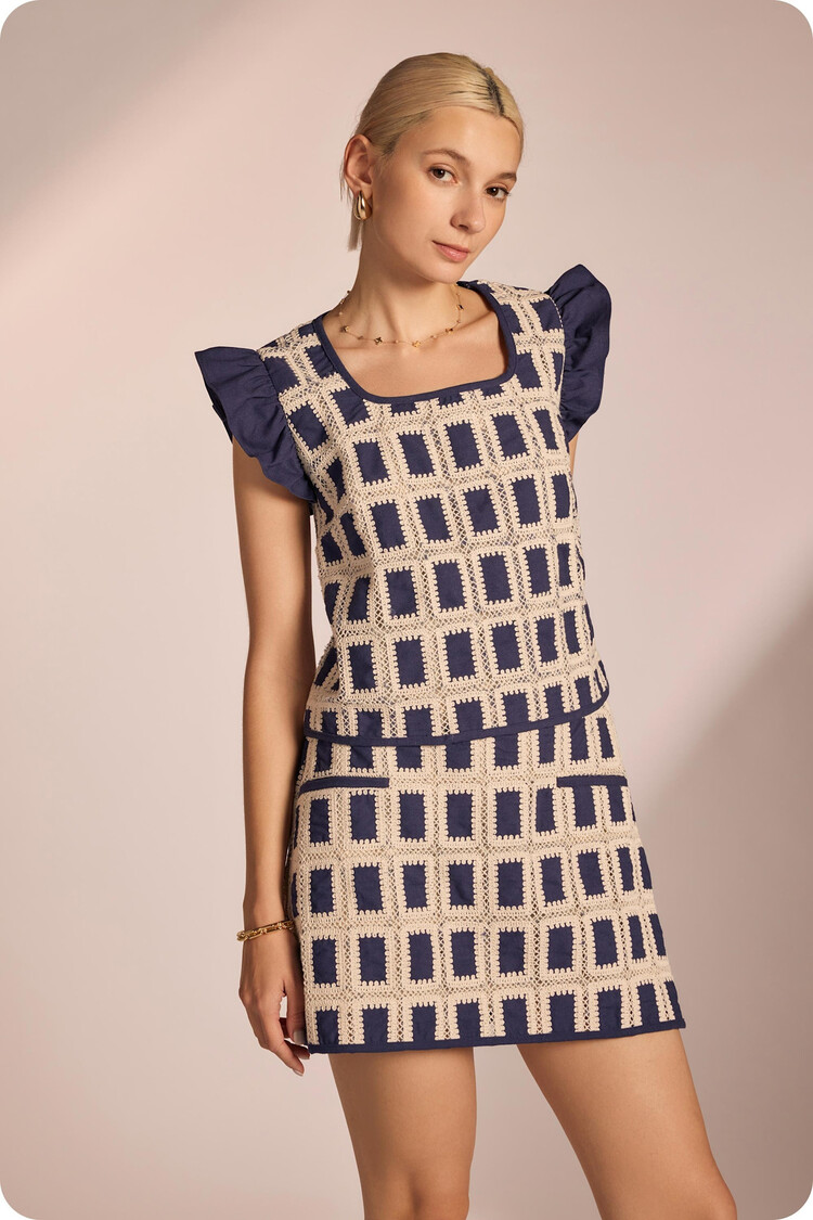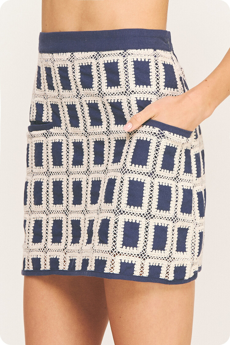 Strut and Bolt Collection. Contrast checkered patchwork mini skirt in crochet and linen fabric. This pencil mini skirt features contrast piping detail at hem/pocket, front welt pockets, contrast waist band with elastic at back, and lining. Pair with skir