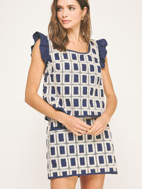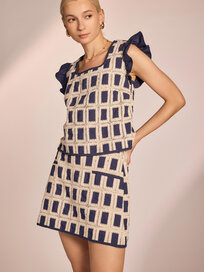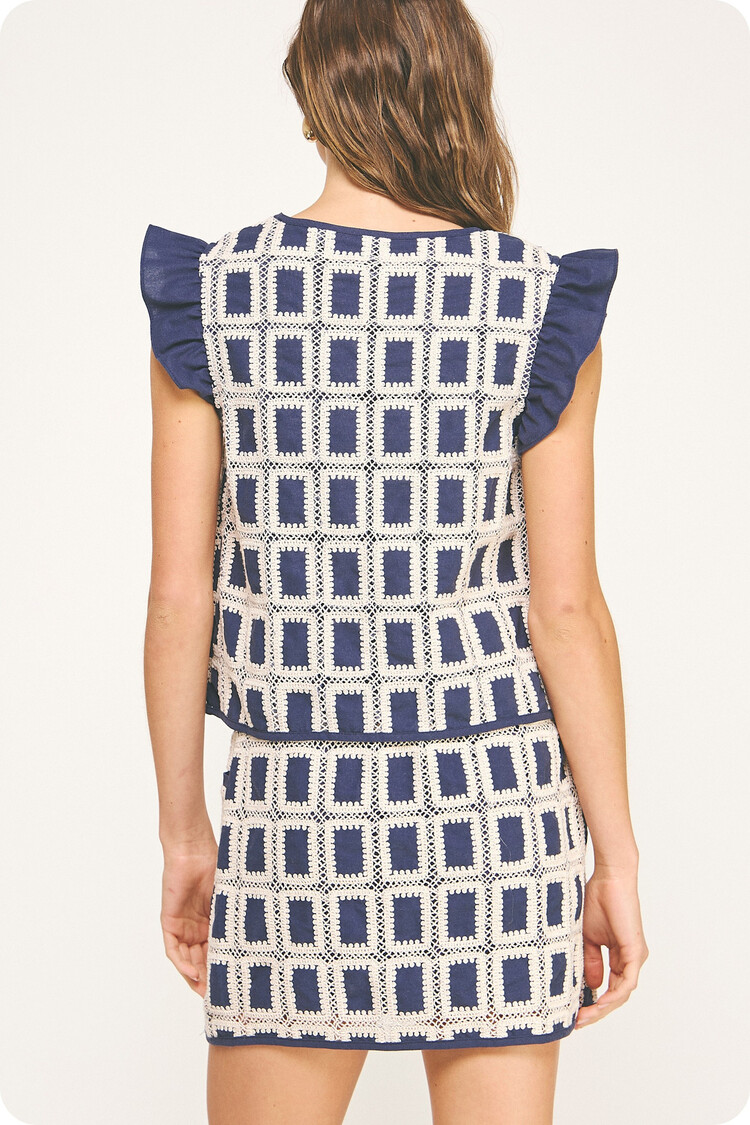 Contrast checkered patchwork top in crochet and linen fabric. This sleeveless style features a square neckline, ruffle cap sleeve, piping detail at neckline/hem, hidden zipper closure, and lining. Match with the skirt!