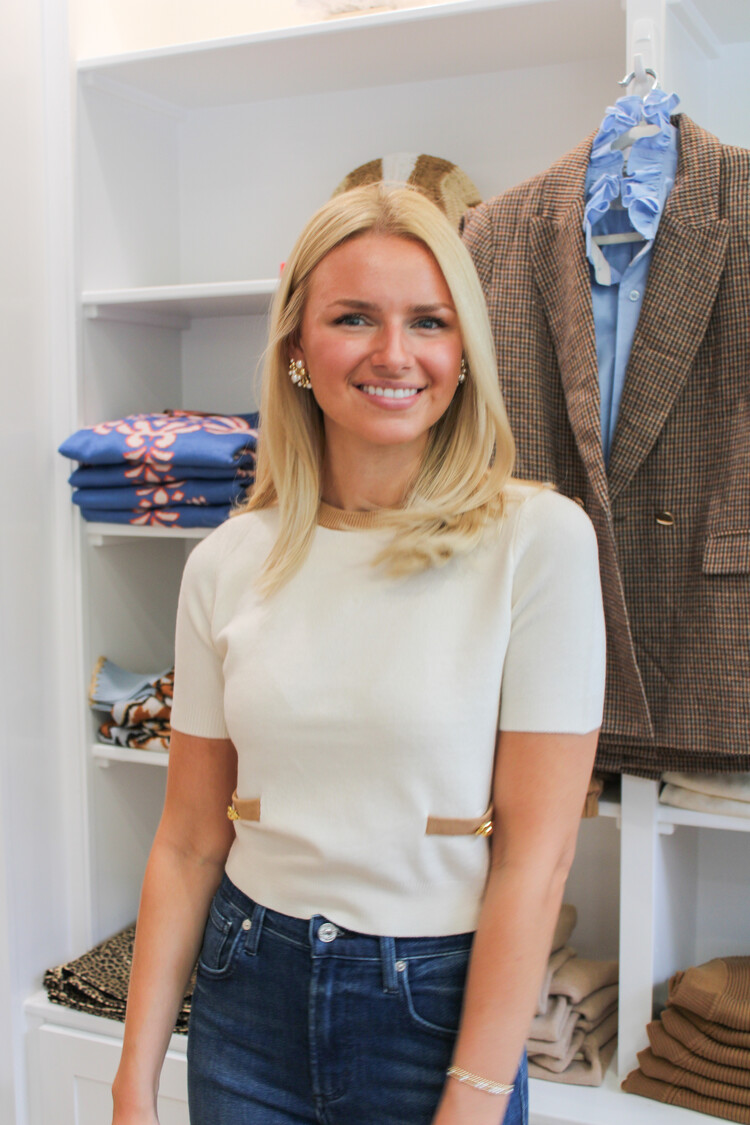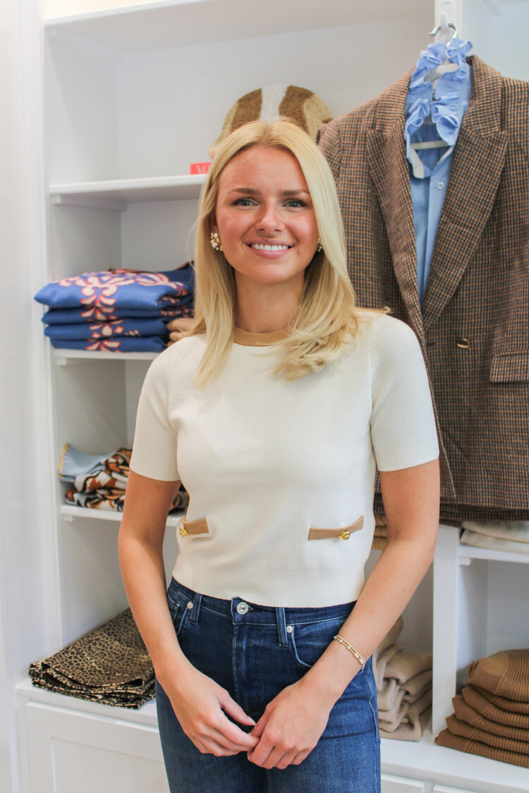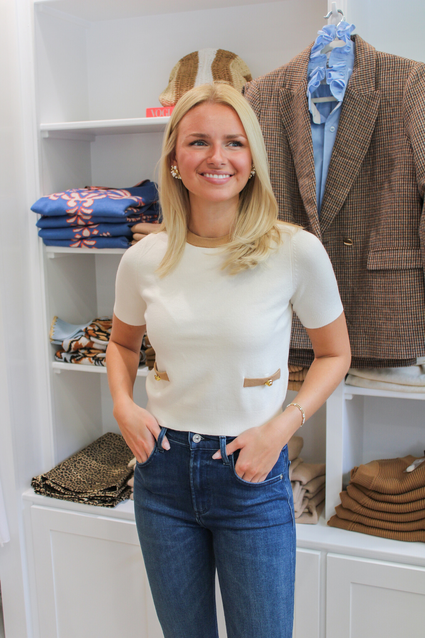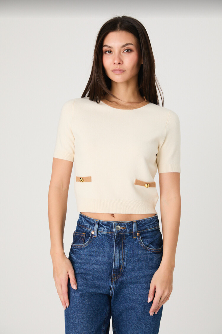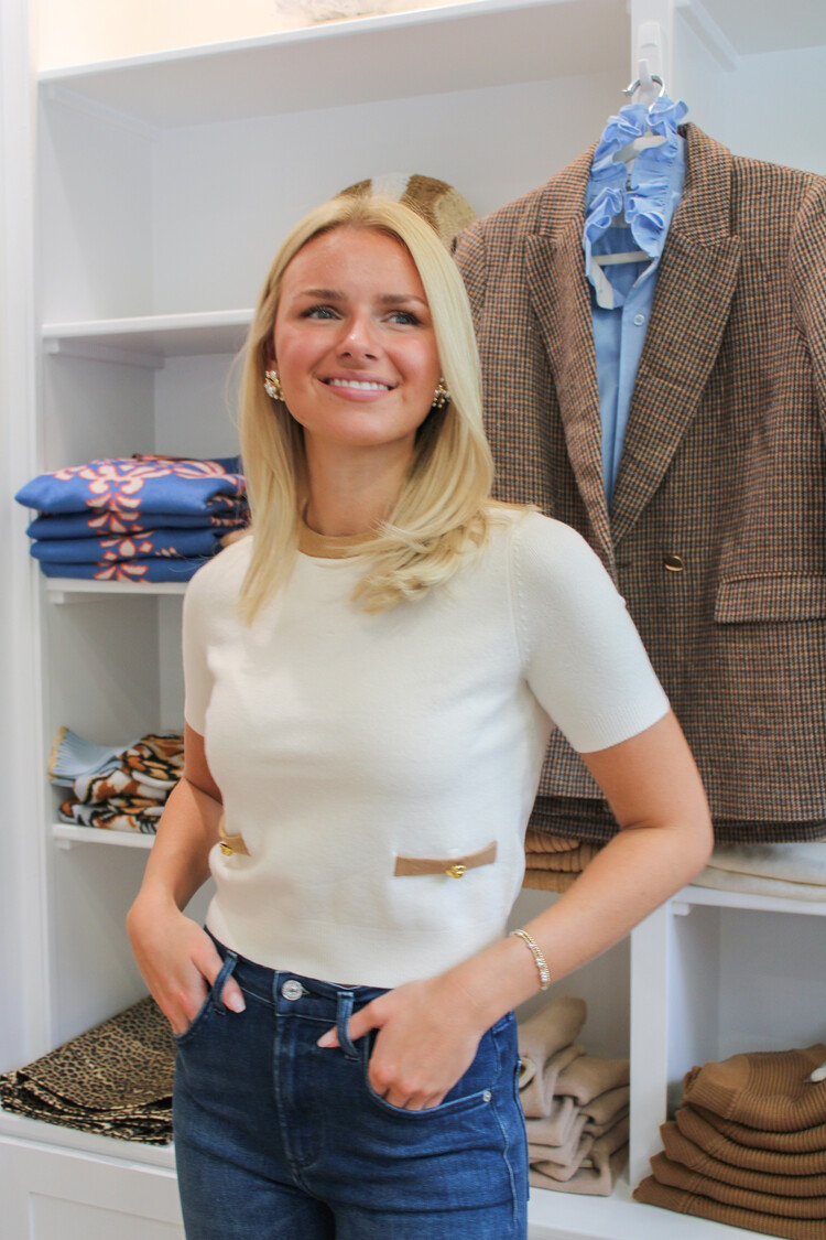 Introducing our Babysoft Short Sleeve Top, perfect for adding a touch of charm to your wardrobe. Crafted from a soft, lightweight knit, it features elegant brown trim along the neckline and two front facing pockets for a classic contrast.