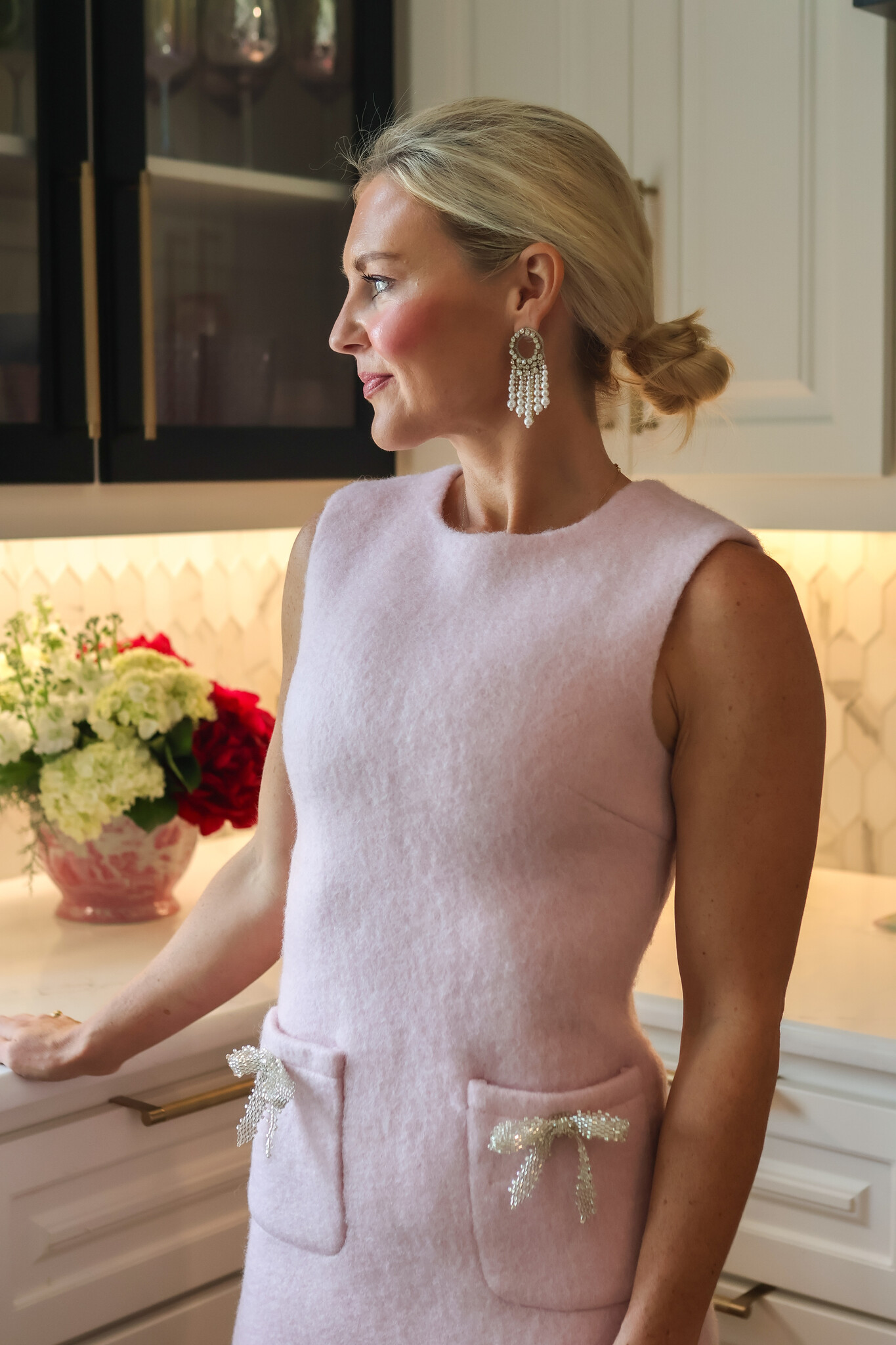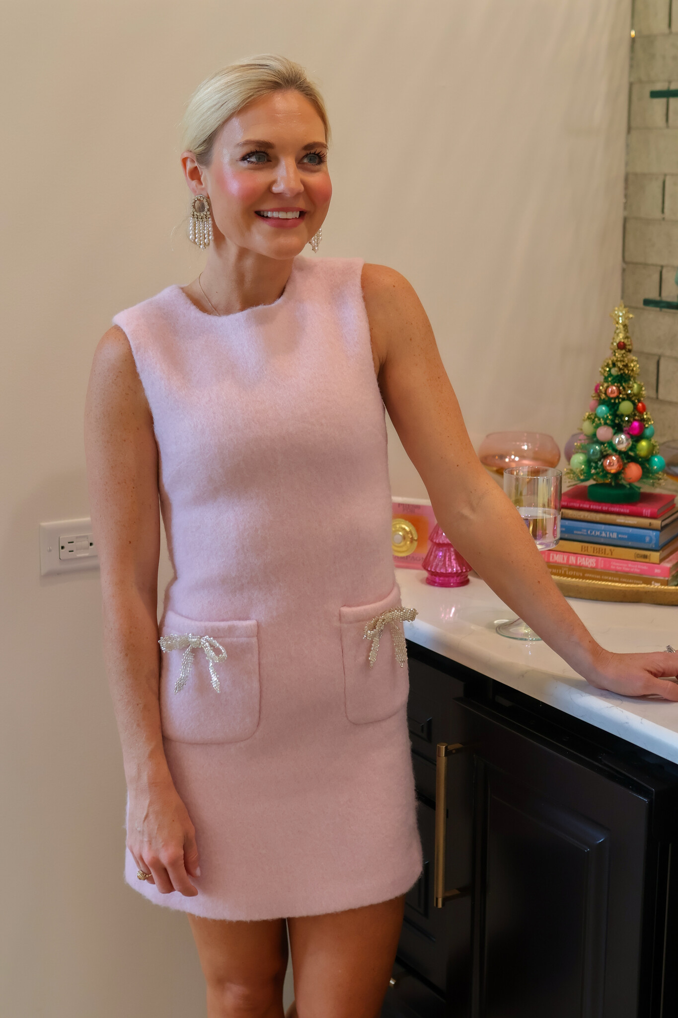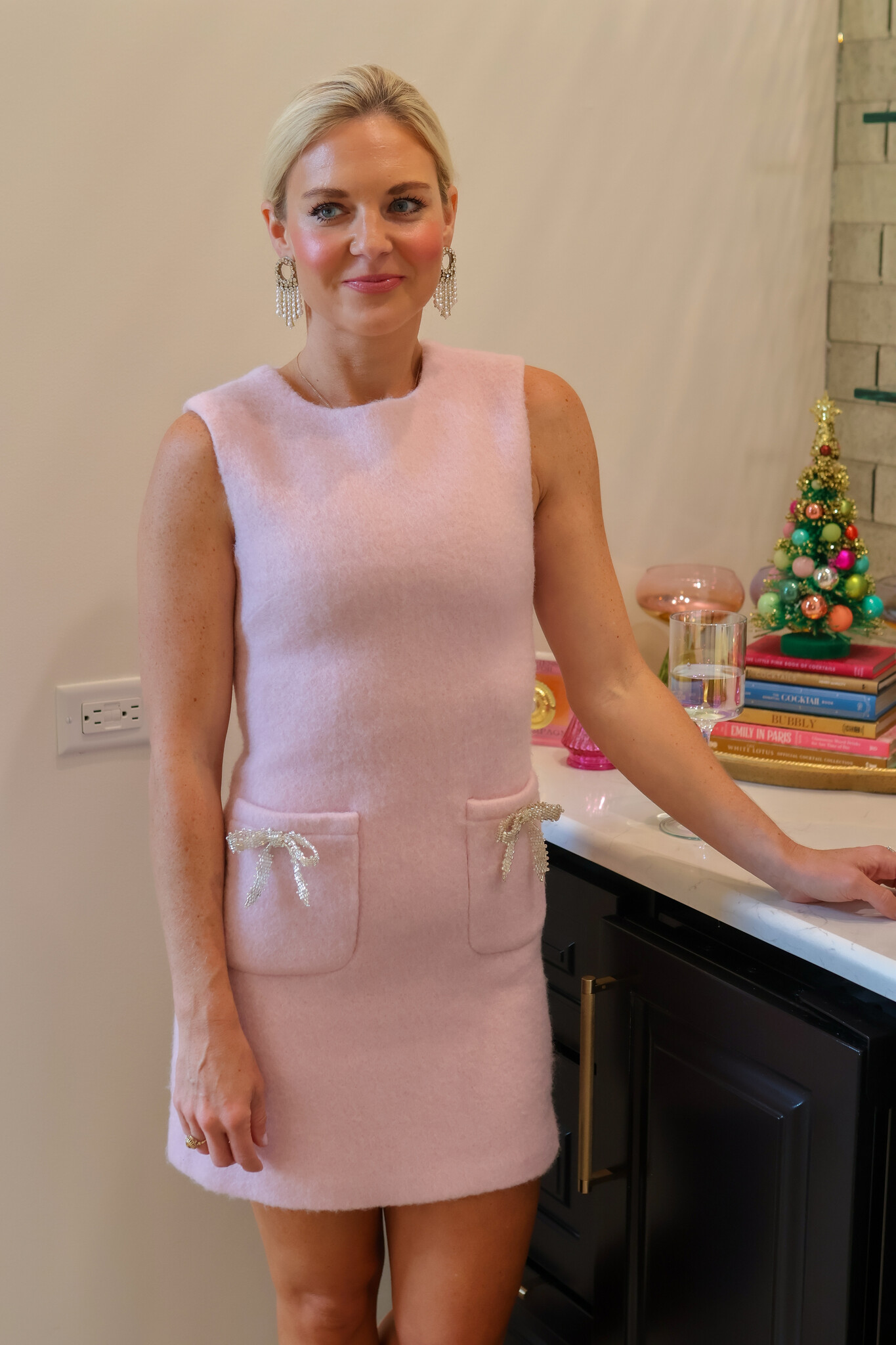 • A beautiful baby pink dress with crystal bows. If between sizes, size up!