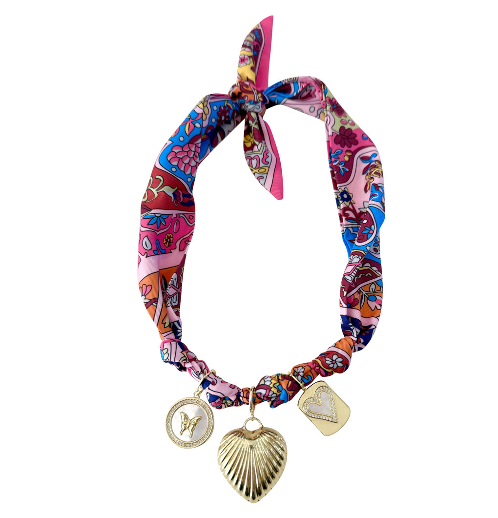 • Adjustable satin scarf necklace with interchangeable 18k gold plated charms.