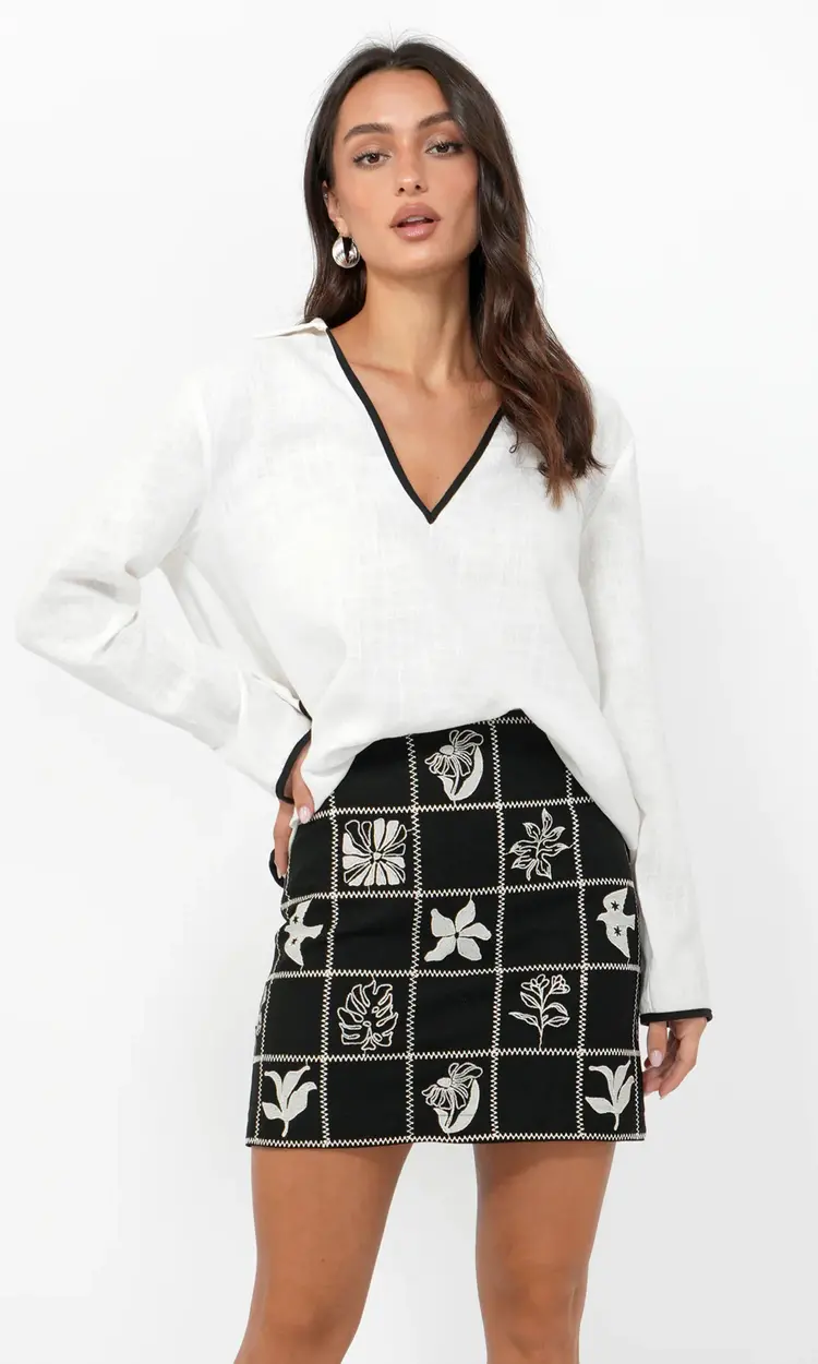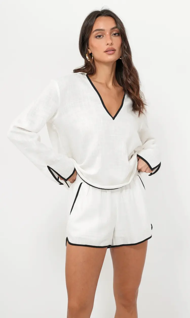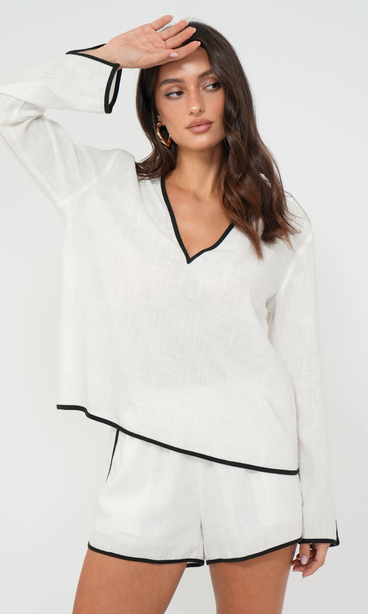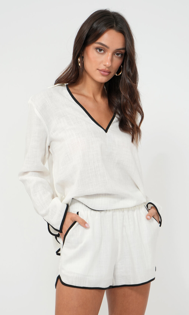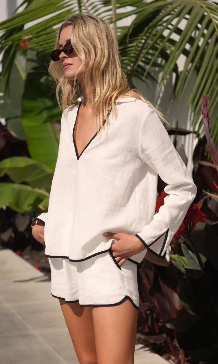 The Beverly Shirt is crafted from breathable linen-blend fabric with contrast black piping along the neckline, sleeves, and hem for a polished touch. A relaxed fit and open collar keep it easygoing. Part of a matching set with the Beverly Linen Shorts.