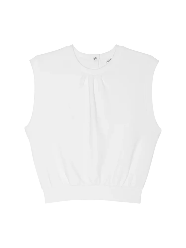 • Contrast ribbing at the neck and armholes with a cropped, controlled hem, shirring at the neckline, and of course one of our signature gold buttons at the back. Style tip: pair with your favorite denim or make it a set with our Reece Sweatpant.