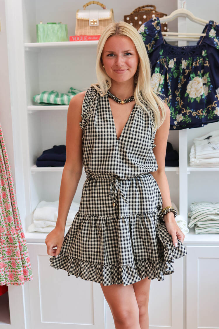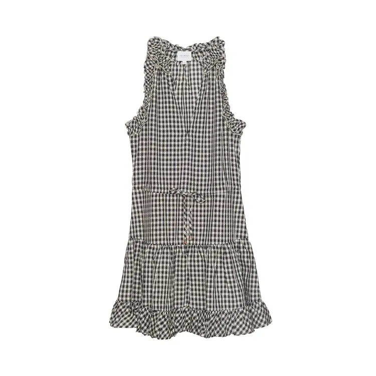 • Feminine and playful, this gingham mini dress features a cinched drawstring waist with gold-tipped ties that allows for adjustability. The sleeveless silhouette is balanced by a flirty skirt and a ruffle-trimmed collar that adds a hint of vintage charm.