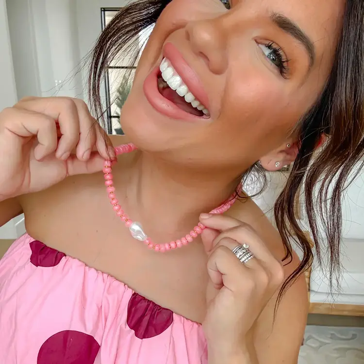 • Soft, sweet, and effortlessly chic — the Blush Tide Necklace features a dreamy strand of rosy pink beads accented with a stunning statement pearl at its center. Wear it solo for a delicate vibe or layer it up for that modern mermaid glow.