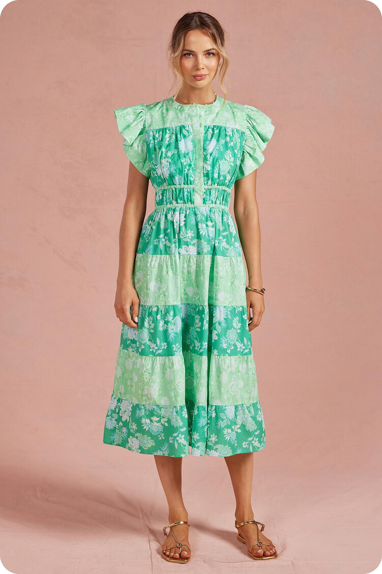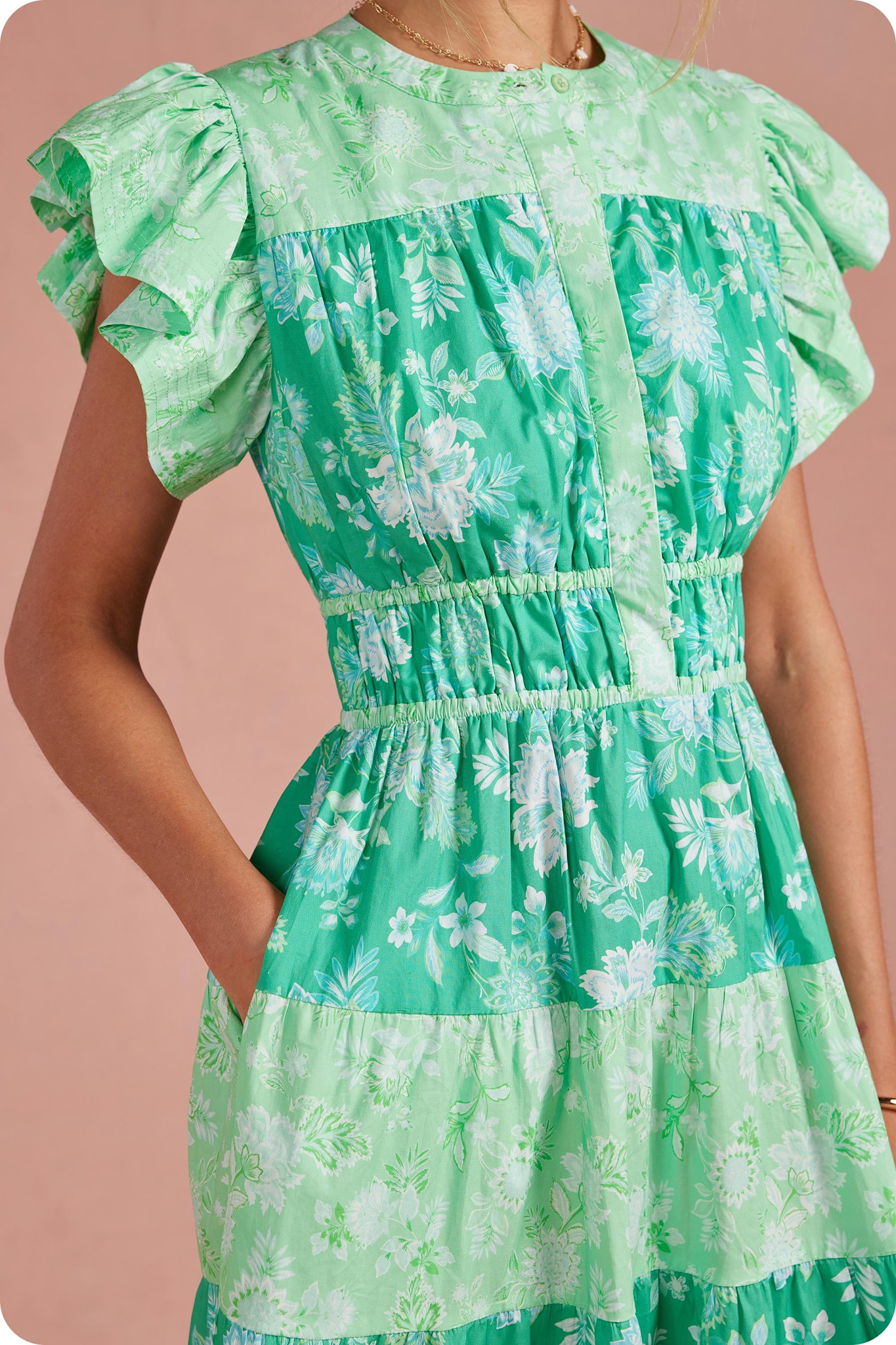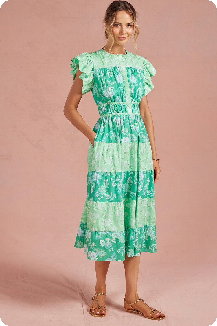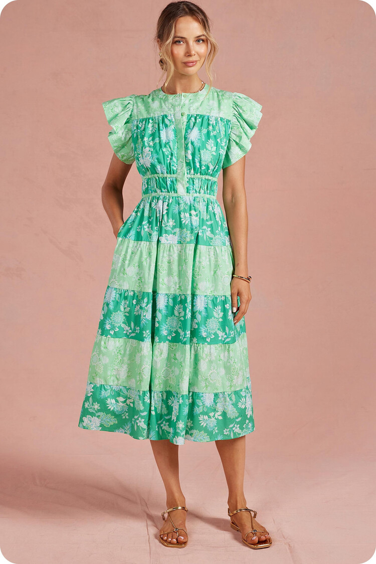 • This dress features color print block, ruffle flutter sleeves, cinched waist with elastic, button down placket closure at bodice, round neckline, side pockets, lining, and tiered skirt. The ideal dress for weddings, garden parties, or everyday wear.