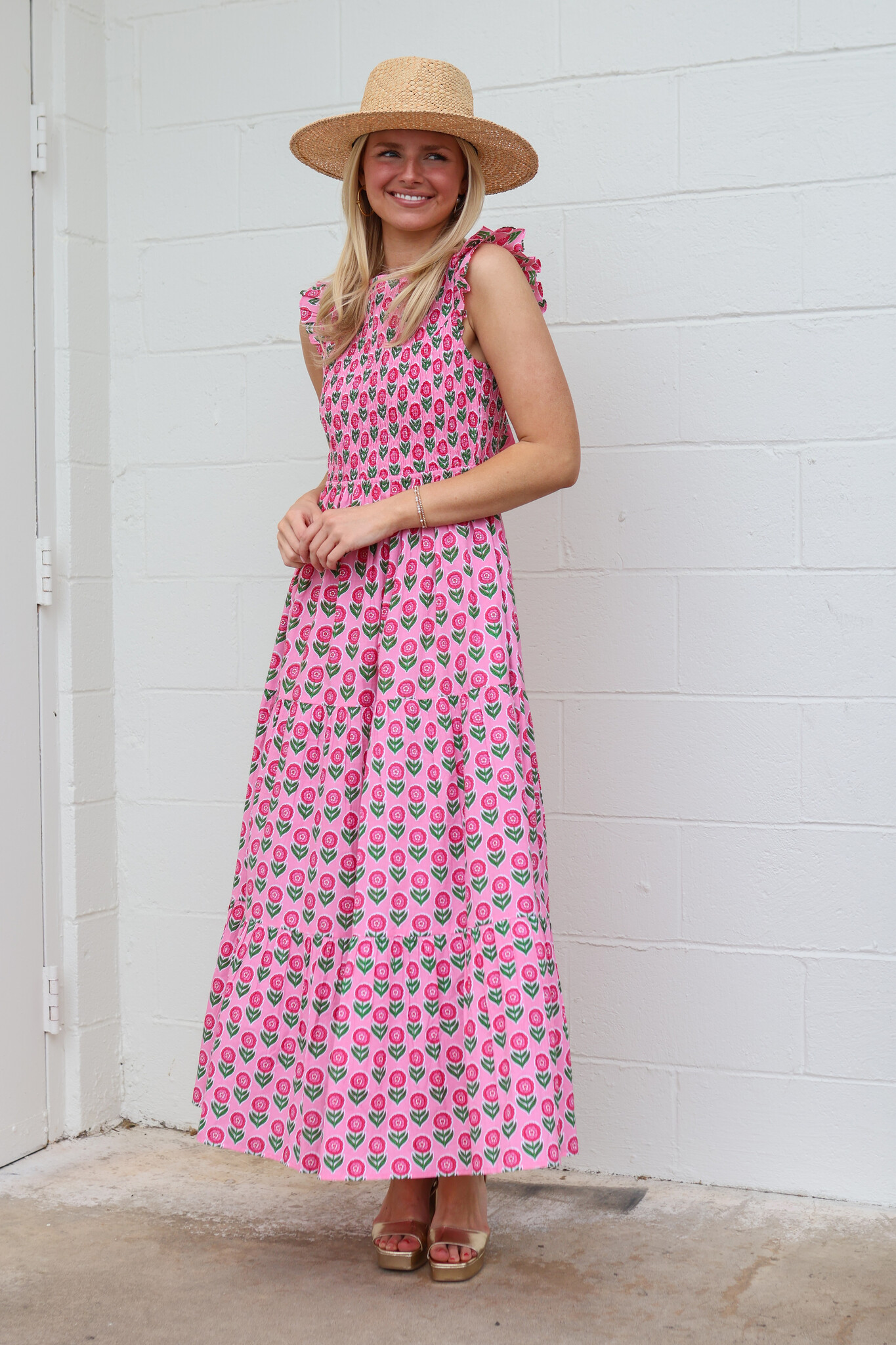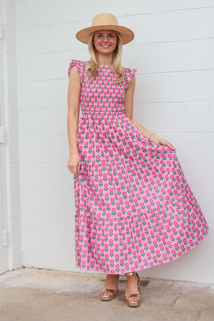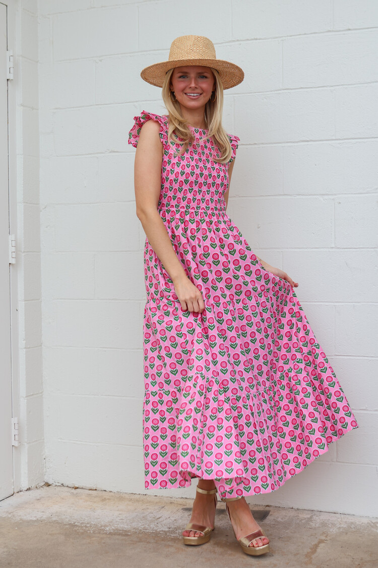 Designed for holidays, weddings, and everything in between, our new Bowie Dress is a true spring showstopper. Hand screen-printed in our irresistibly sweet Marigold Blush buta, this elegant maxi is one you’ll reach for time and time again.