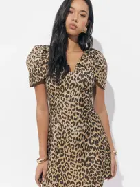 This dress showcases a pattern of flowers set against a contrasting background, utilizing a Beige and Navy color palette for a sophisticated look. The silhouette is a flirty mini dress length, balanced by romantic bell sleeves that add volume and movement
