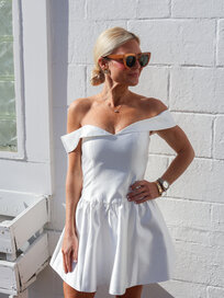 Featured in an elegant Ivory color, this dress is crafted from a luxurious satin fabric, giving it a beautiful sheen and a fluid, expensive drape. The silhouette is defined by the off-shoulder neckline, which frames the collarbones and the drop waist.