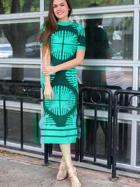 The Emery Dress is a vibrant mini that captures attention with its ziggy palm print. Featuring a relaxed silhouette with a gathered neckline and long sleeves, it balances playful prints with effortless elegance.