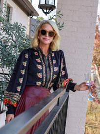 The Emily Top is the perfect button front blouse, featuring a mandarin collar, covered placket, and balloon sleeves. This season, she is cut from a light satin fabric in our Holiday Chintz Teal print, great for dressing up or down this season.
