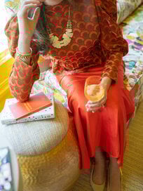 The Zoe Top in Tangerine Mod blends vintage inspiration with a modern, tailored fit. Featuring a structured mock neckline, puff sleeves, and a feminine peplum hem, this style is finished with an exposed gold zip closure at the back for a refined touch.