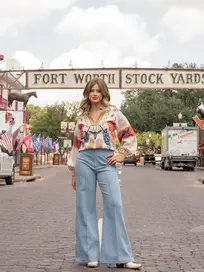 The Lolli Sweater showcases a stand collar with a notched neckline & blouson sleeves finished with ribbed cuffs. Knit directly into the fabric, the embroidered Lone Star icons bring western-inspired flair, from boots and longhorns to and bluebonnets.