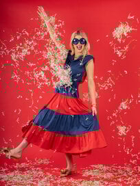 The Tiered Maxi Skirt in Americano brings bold, patriotic fashion to summer styling. Crafted in crisp cotton poplin, its color-blocked tiers create playful movement and volume, while the elastic waistband offers a comfortable, figure-flattering fit.