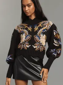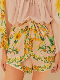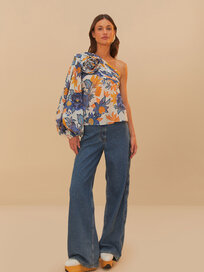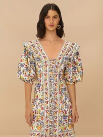 This playful piece boasts a vibrant floral pattern and a charming V neckline, complemented by delicate ruffle details. The voluminous sleeves and tie-back design add a touch of whimsy, making it an enchanting choice for any gathering.