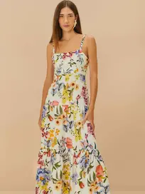 Crafted from responsible materials, this dress radiates charm with its intricate green and ivory tapestry patterns. The square neckline and playful twisted straps add a touch of whimsy, while the soft linen flows gracefully into a midi-length silhouette.