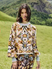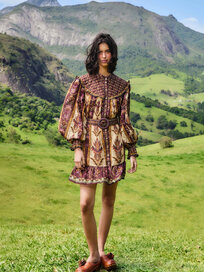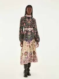 Embrace a graceful flow with the Sand Renata Floral Long Sleeve Dress, featuring a high neckline that enhances its delicate silhouette. This dress blooms with intricate floral patterns in warm rose, burgundy, and earthy tones, layered in a fluid shape.