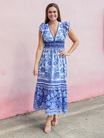 This delightful piece showcases an enchanting blue botanical pattern against a gentle off-white backdrop. The V neckline adds a touch of grace, while playful ruffled cap sleeves and intricate smocking at the waist create a flattering silhouette.