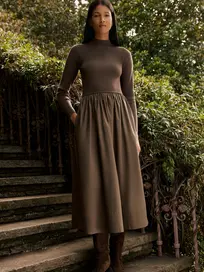 This stylish dress features a mock turtleneck and a figure-flattering bodice balanced by a gathered skirt and side pockets. Equal parts chic and comfortable, the mixed-media silhouette is destined to become one of the most well-loved pieces in your closet