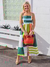 The Lillian Dress in Vista is the perfect vacation dress. With its vibrant colors and beachy silhouette, it is the perfect addition to your resort wardrobe. The Vista print is a graphic mix of stripes and blocks in sun-washed greens, blues, and clay tones