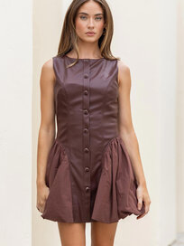 Button down detail bubble mini dress in faux leather and cotton poplin fabric. This sleeveless babydoll mini dress features bubble side panel in poplin fabric, faux leather bodice with button down detail, round neck, lining, and hidden zipper closure.