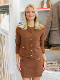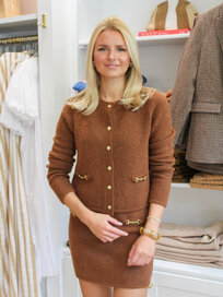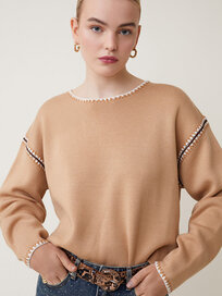 This sweater features a refined round neck adorned with delicate pearl embellishments, adding a touch of sophistication to its classic knit design. The short sleeves offer a graceful silhouette, making it perfect for both casual and dressier occasions.