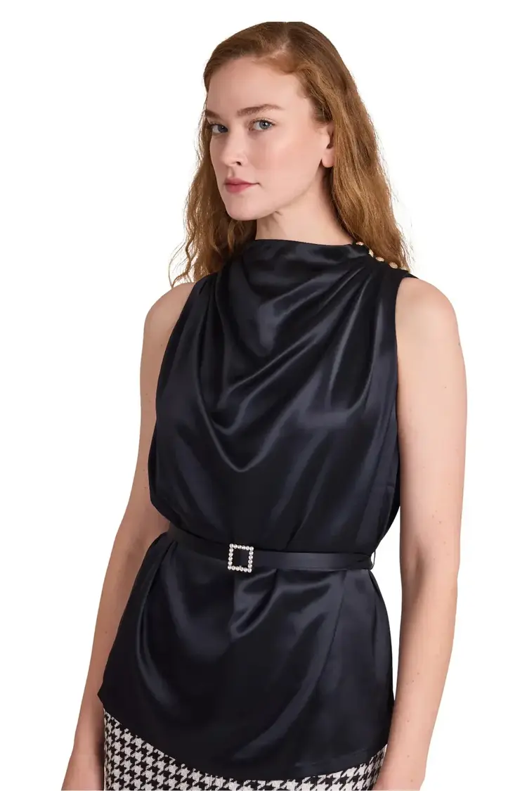 Mock neck sleeveless silhouette with a tie belt