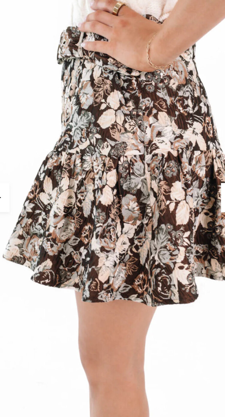 Add a timeless touch to your fall wardrobe with this brown & cream belted skort in a flattering flared silhouette. The classic hues & feminine shape make it a standout piece for seasonal styling, from casual days to festive evenings.